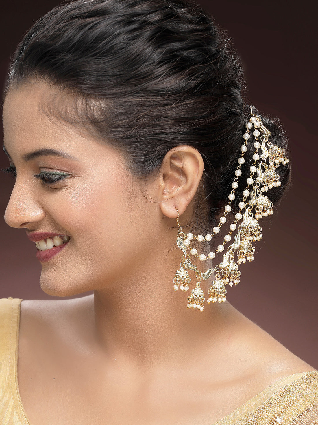 KARATCART Traditional Gold-Plated Peacock Kundan and Pearl Kaanchain Earrings for Women