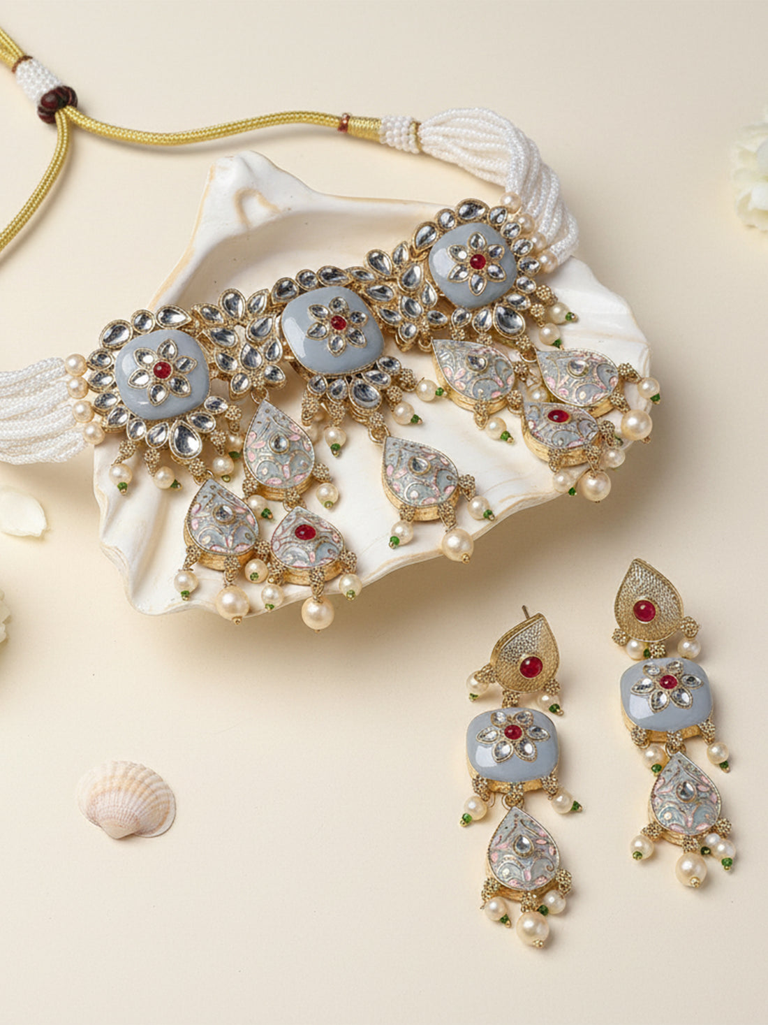 KARATCART Gold Plated Kundan Choker Grey Jewellery Set for Women