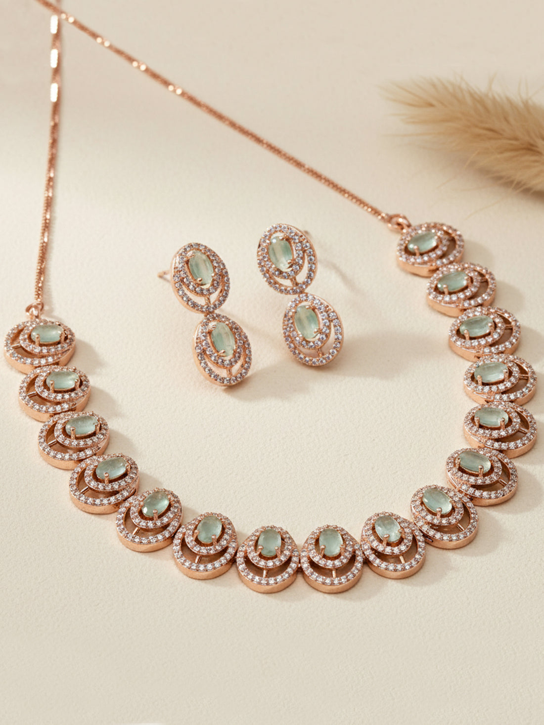 Karatcart Rose Gold Plated Light Green Floral CZ Stone Studded Jewellery Set