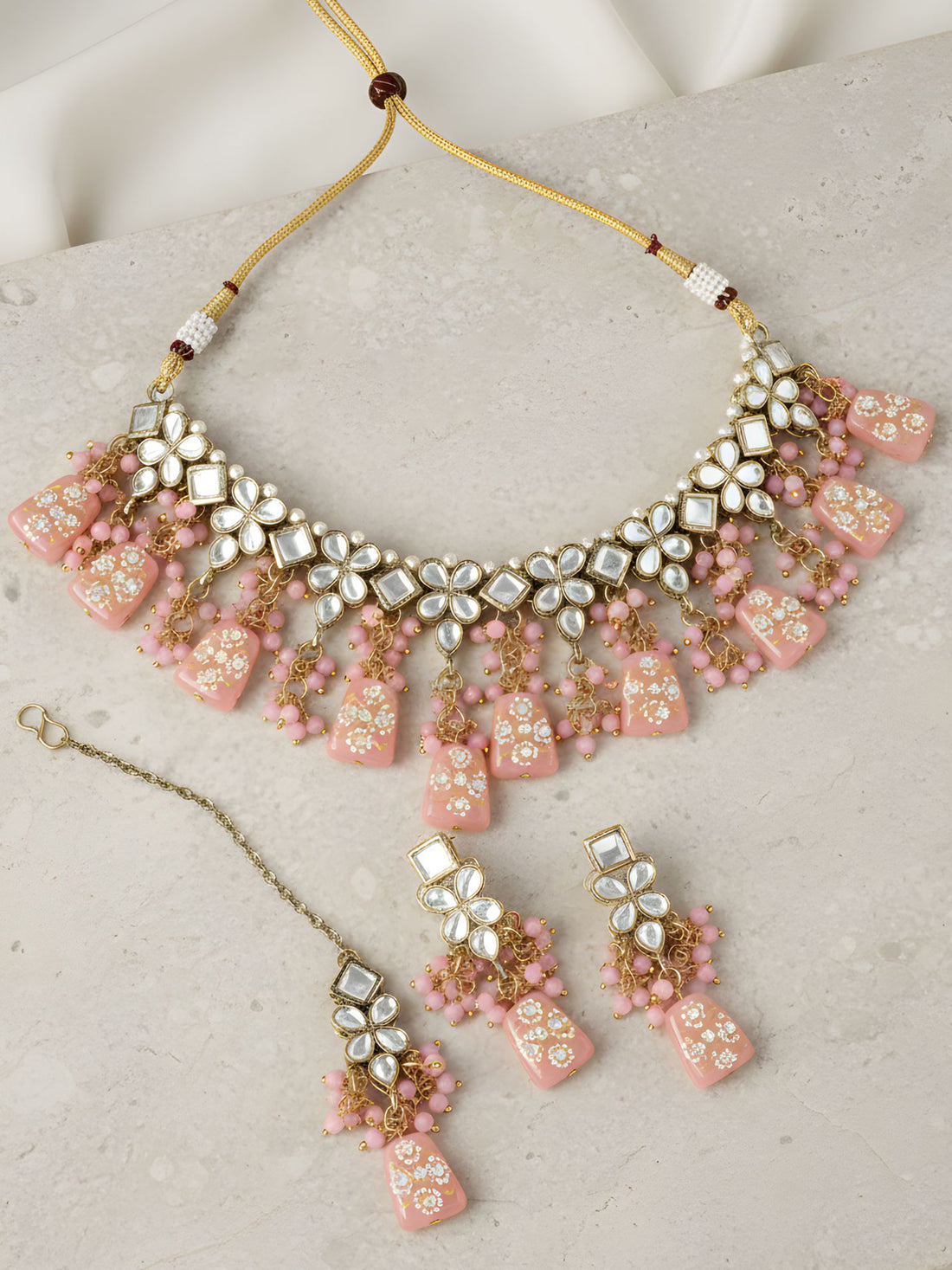 Karatcart Gold Polki Kundan Pink Tumble Choker Necklace Setfor Women