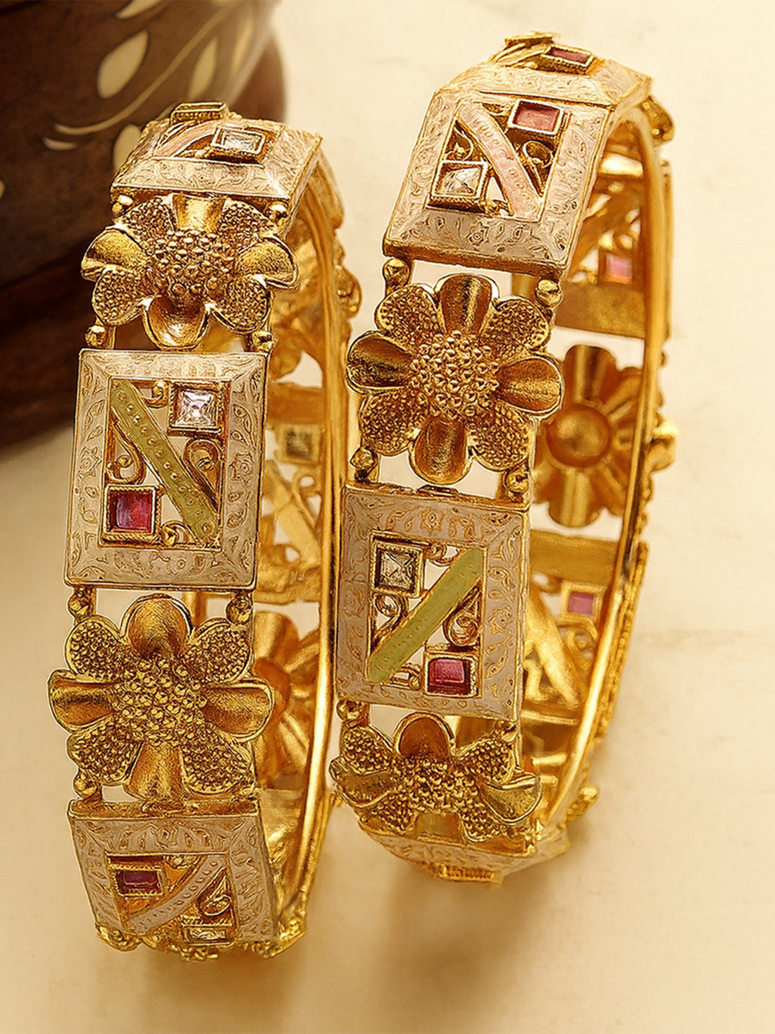 Karatcart Set of 2 Gold Plated Multi Color Meena Floral Bangles for Women