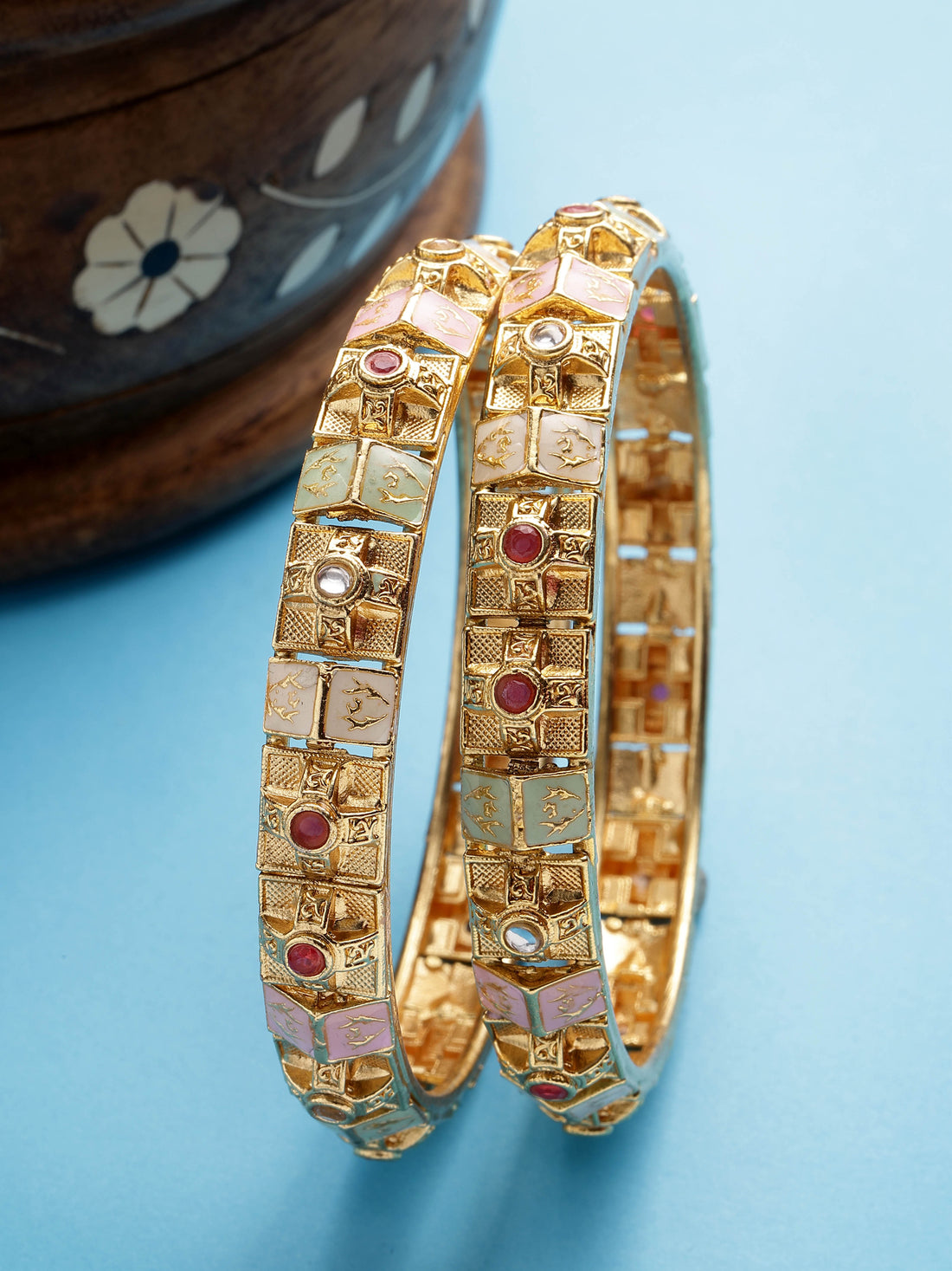 Karatcart Set of 2 Gold Plated Pink Meena Floral Design Bangles for Women