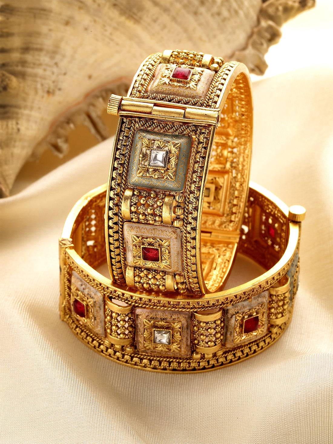 Karatcart Set of 2 Antique Gold Plated Multicolor Kundan Studded Bangles for Women