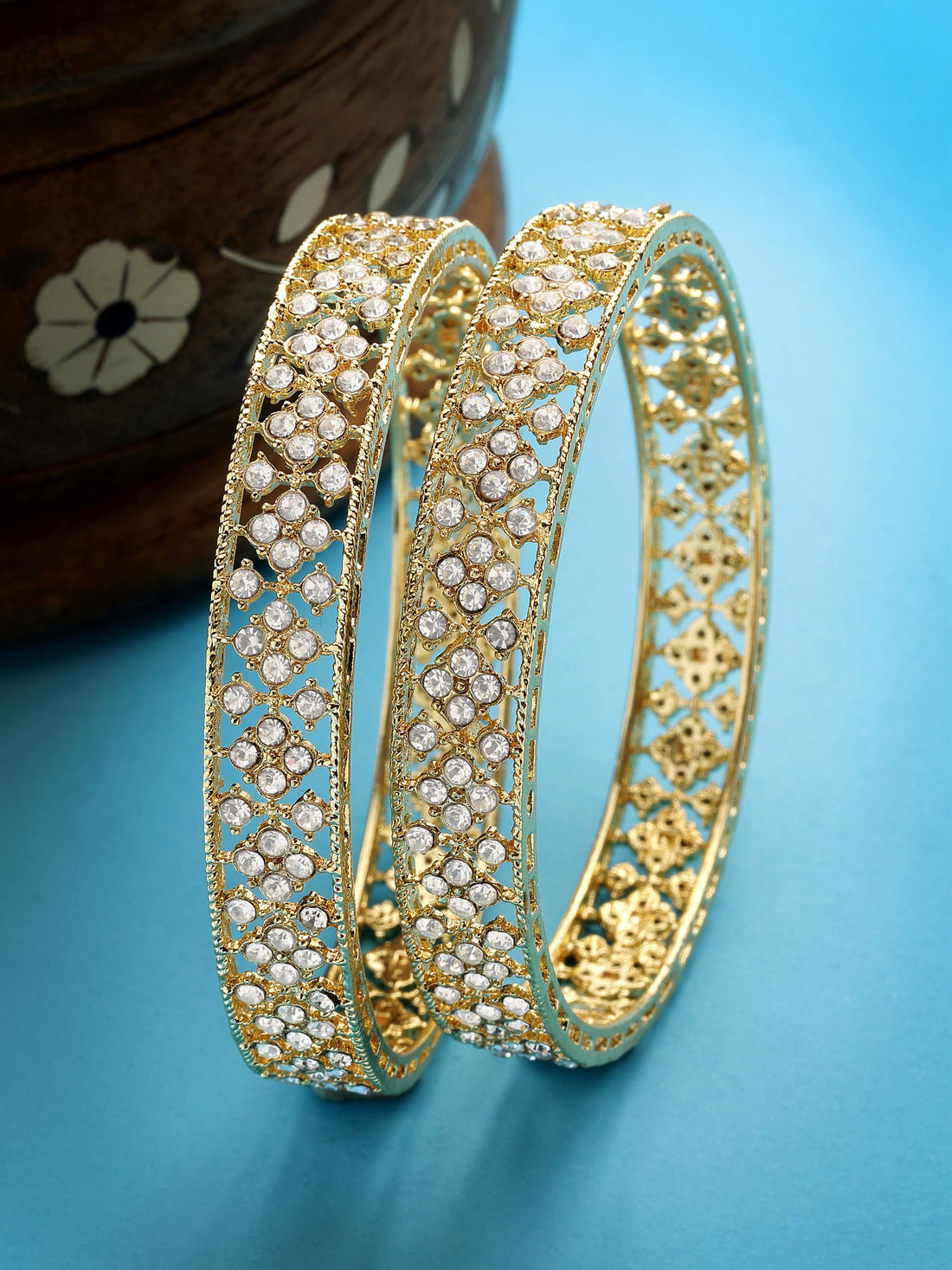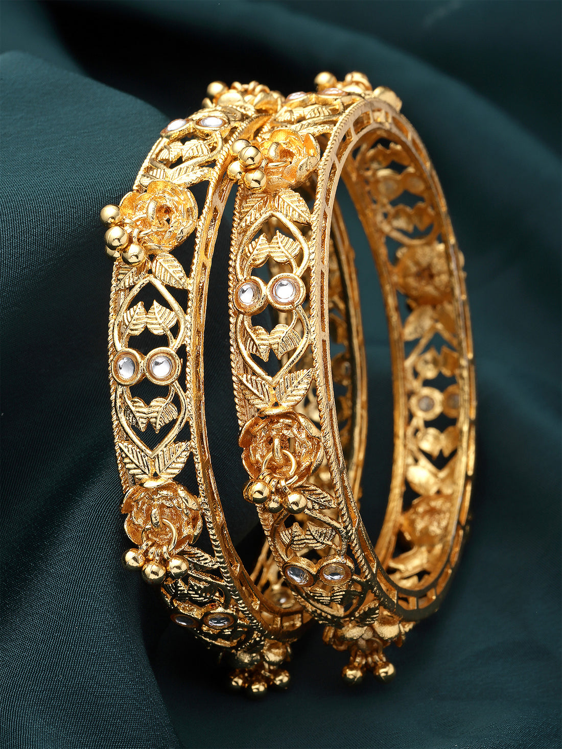 Karatcart Floral Design Set of 2 American Diamond Studded Gold Plated Bangles for Women