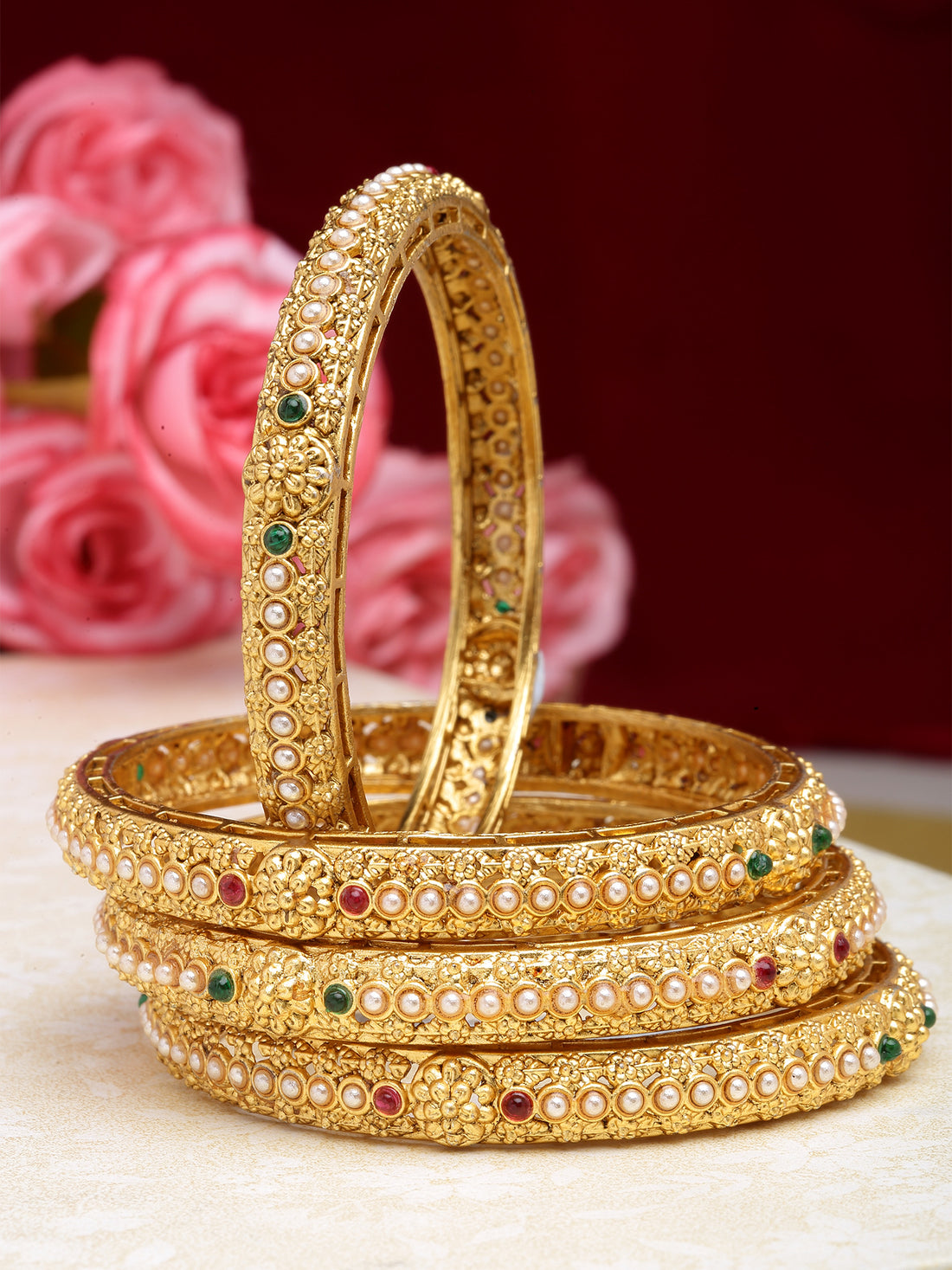 Karatcart Set of 4 Gold-Plated Pearl Studded Bangles for Women