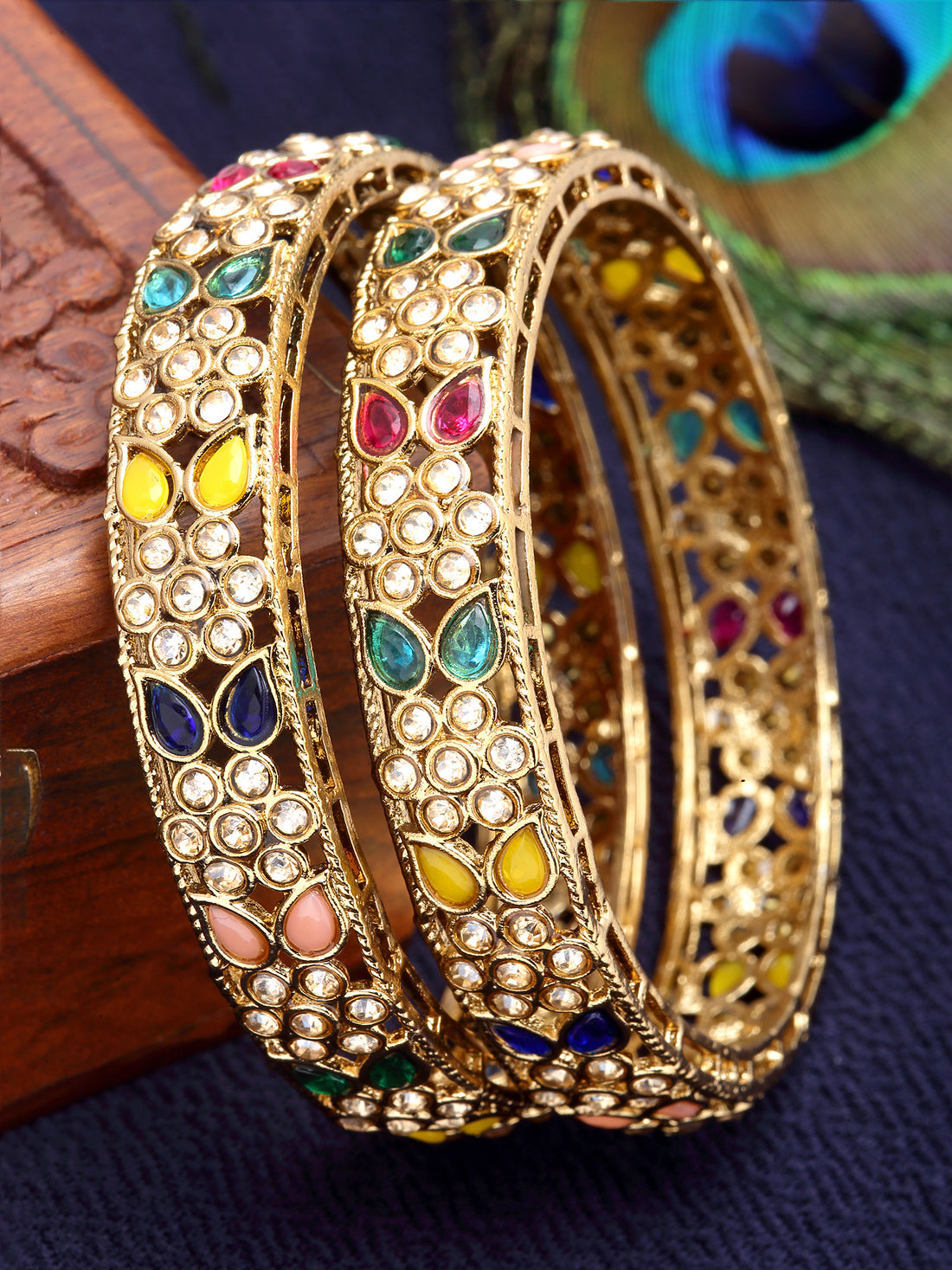 Karatcart Set of 2 Antique Gold Plated Drop Shape Multicolor Stone Rajwadi Bangles for Women
