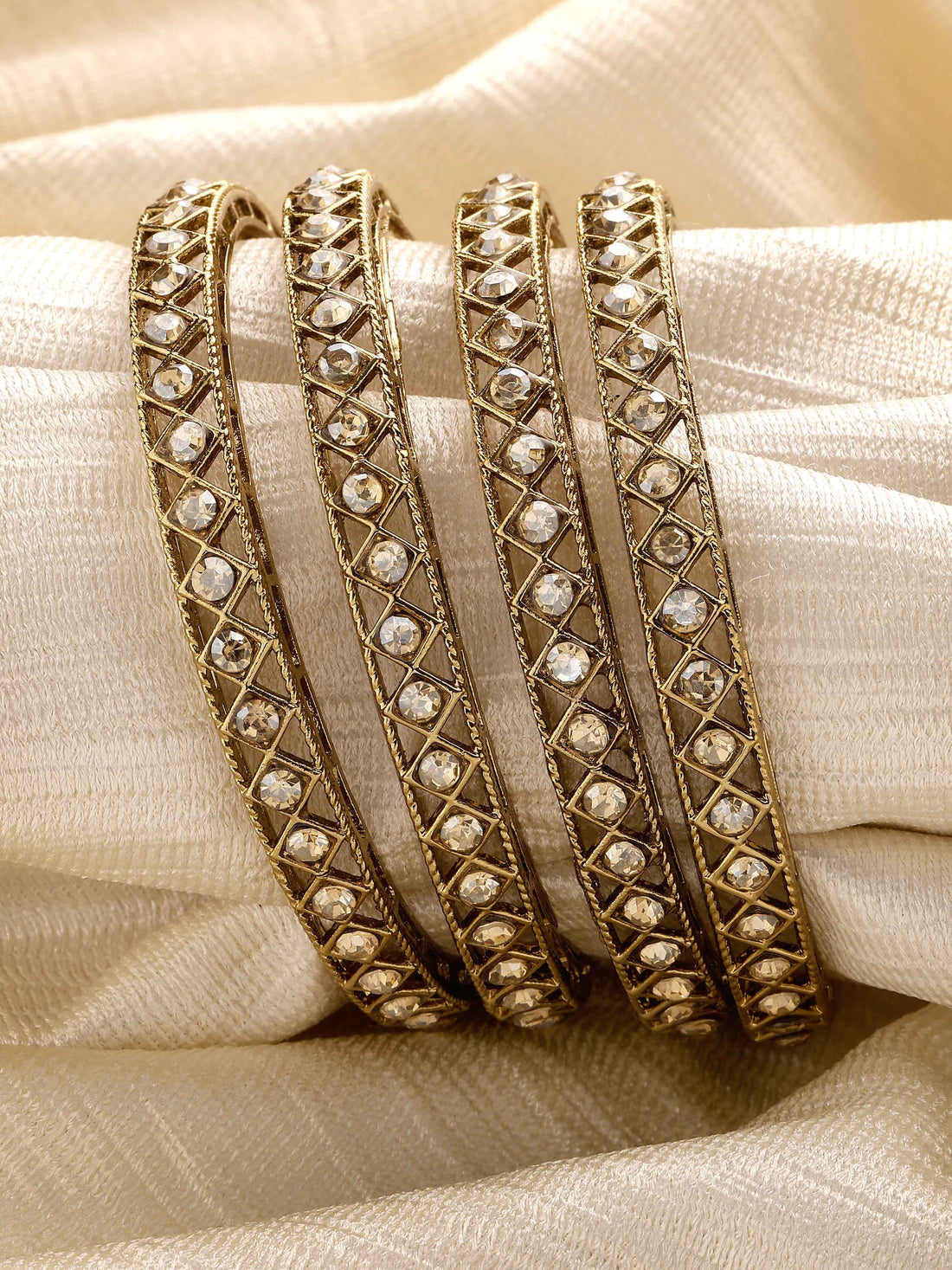 Karatcart Set of 4 Diamond Shape Kundan Studded Antique Gold Plated Bangles for Women