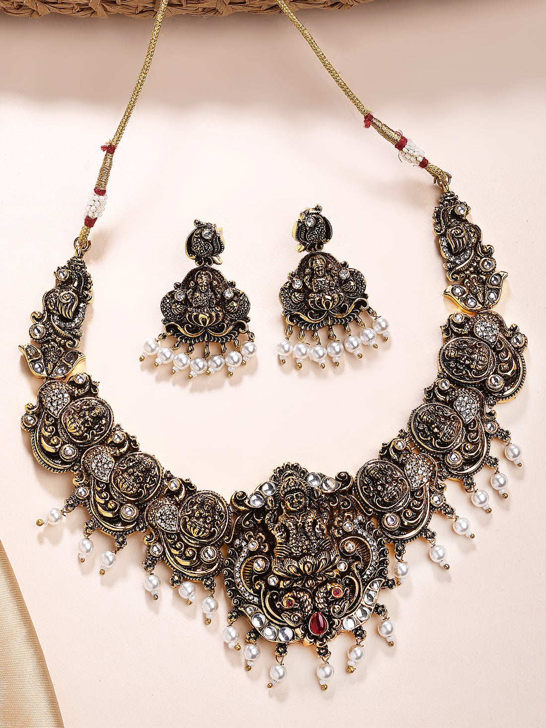 KARATCART Traditional South Indian Black and Gold Plated Laxmi Mata Temple Jewellery Set