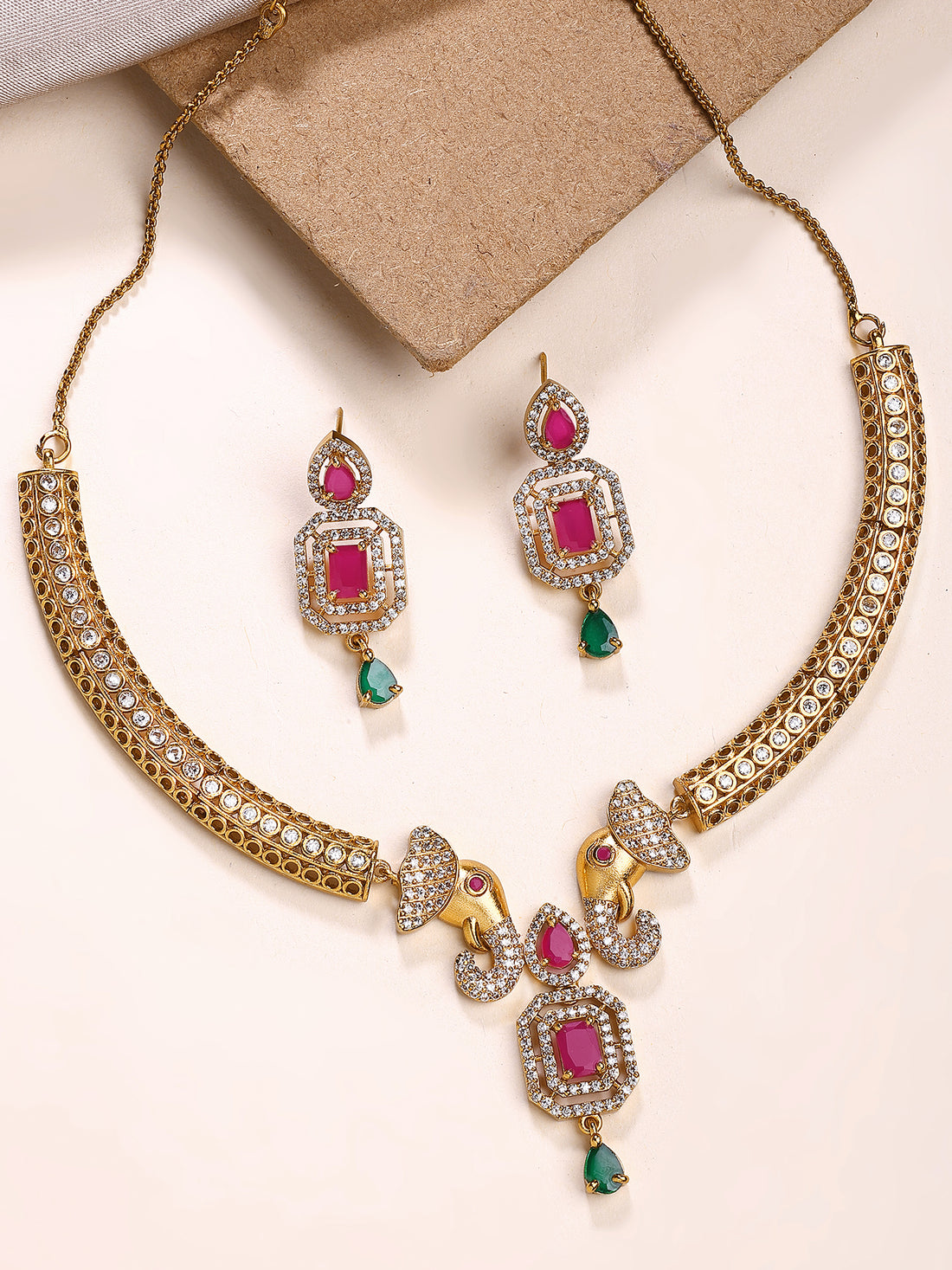 KARATCART Royal Gold-Plated Elephant Motif American Diamond Temple Jewellery Set for Women