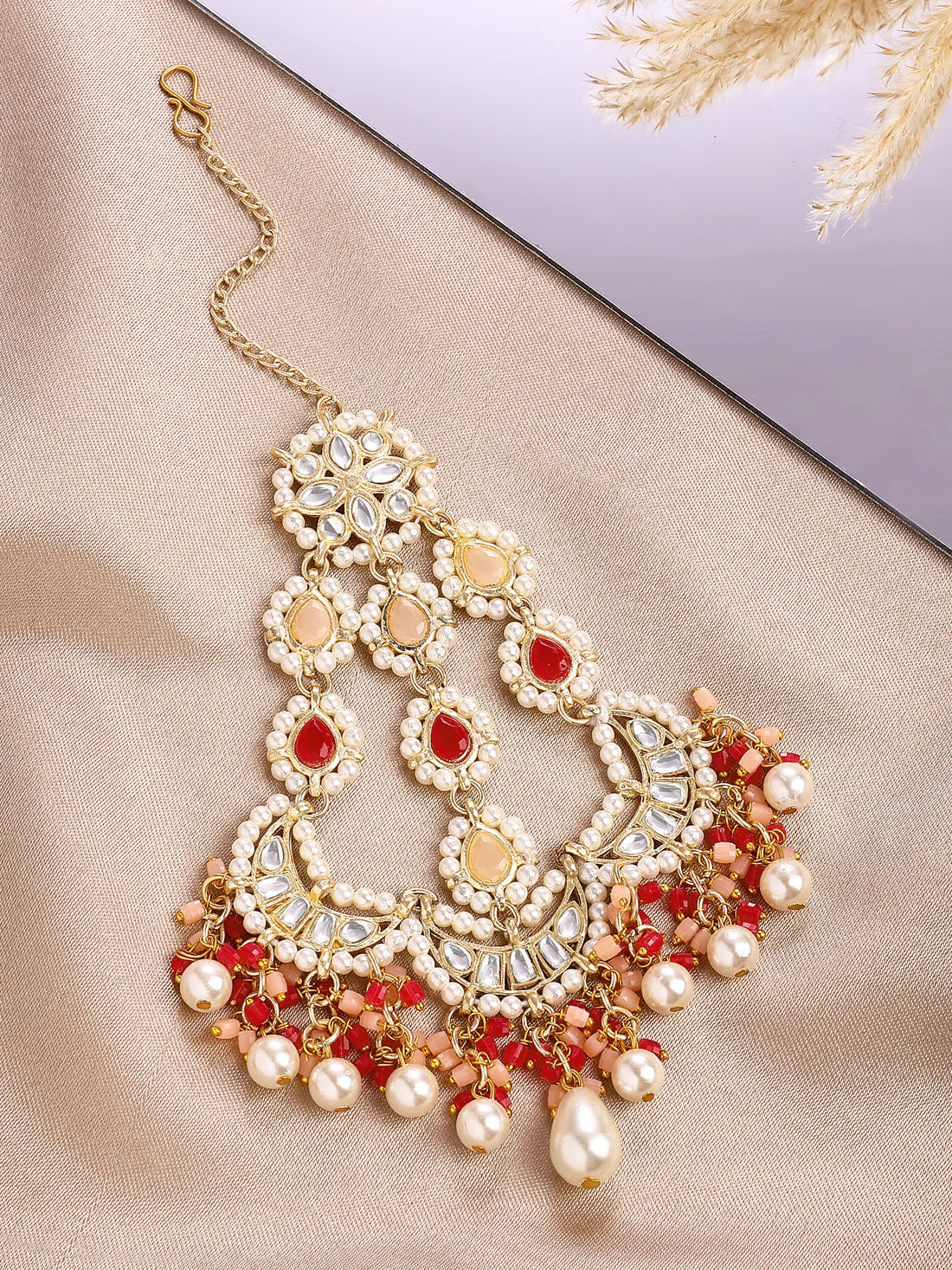 KARATCART Traditional Gold-Plated Red and Peach Crystal Studded Kundan Passa for Women