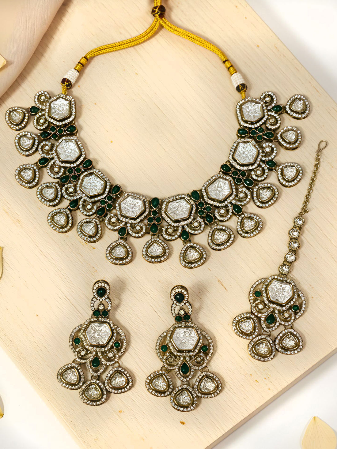 KARATCART Traditional Green Teardrop Kundan Antique Gold-Plated Jewellery Set for Women