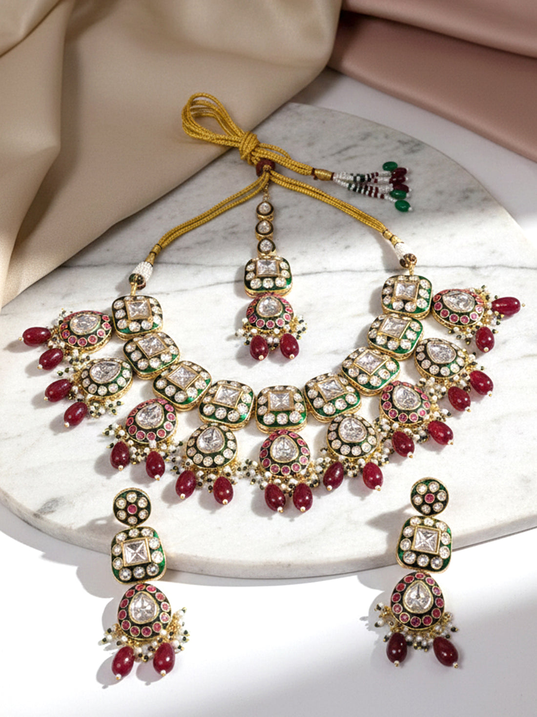 KARATCART Designer Bridal Wear Red Beads Kundan Gold-Plated Jewellery Set for Women
