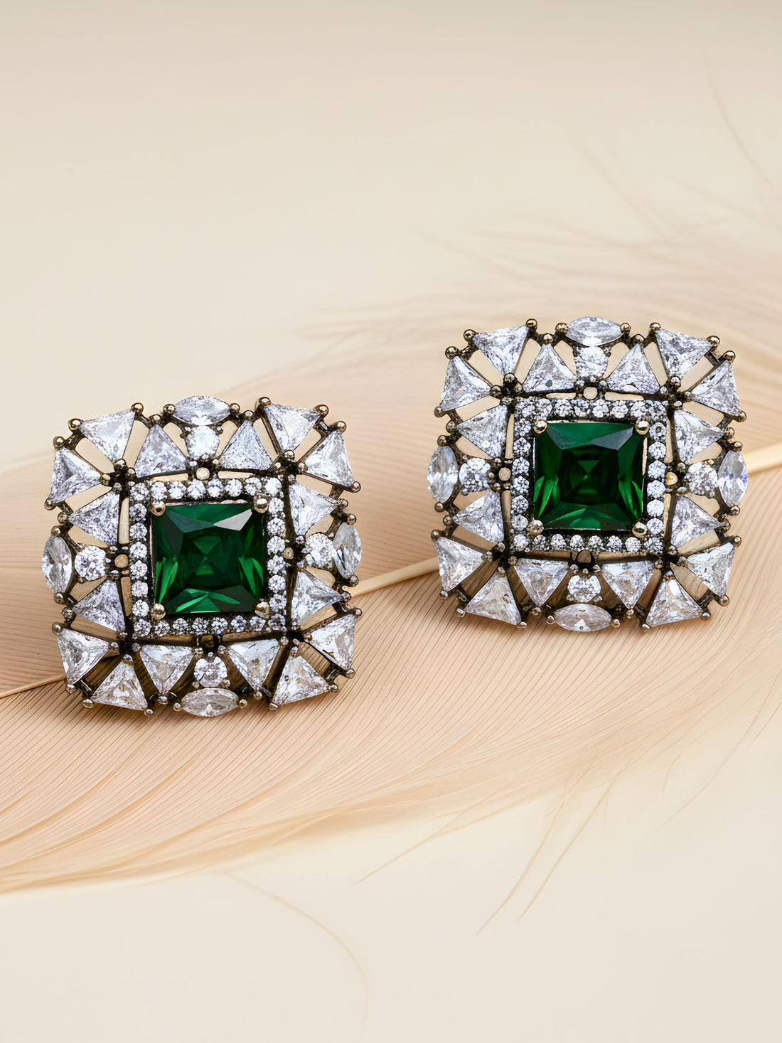 Green American Diamond Stud Earrings. It is a high-quality oxidised silver jewellery embellished with kundan....