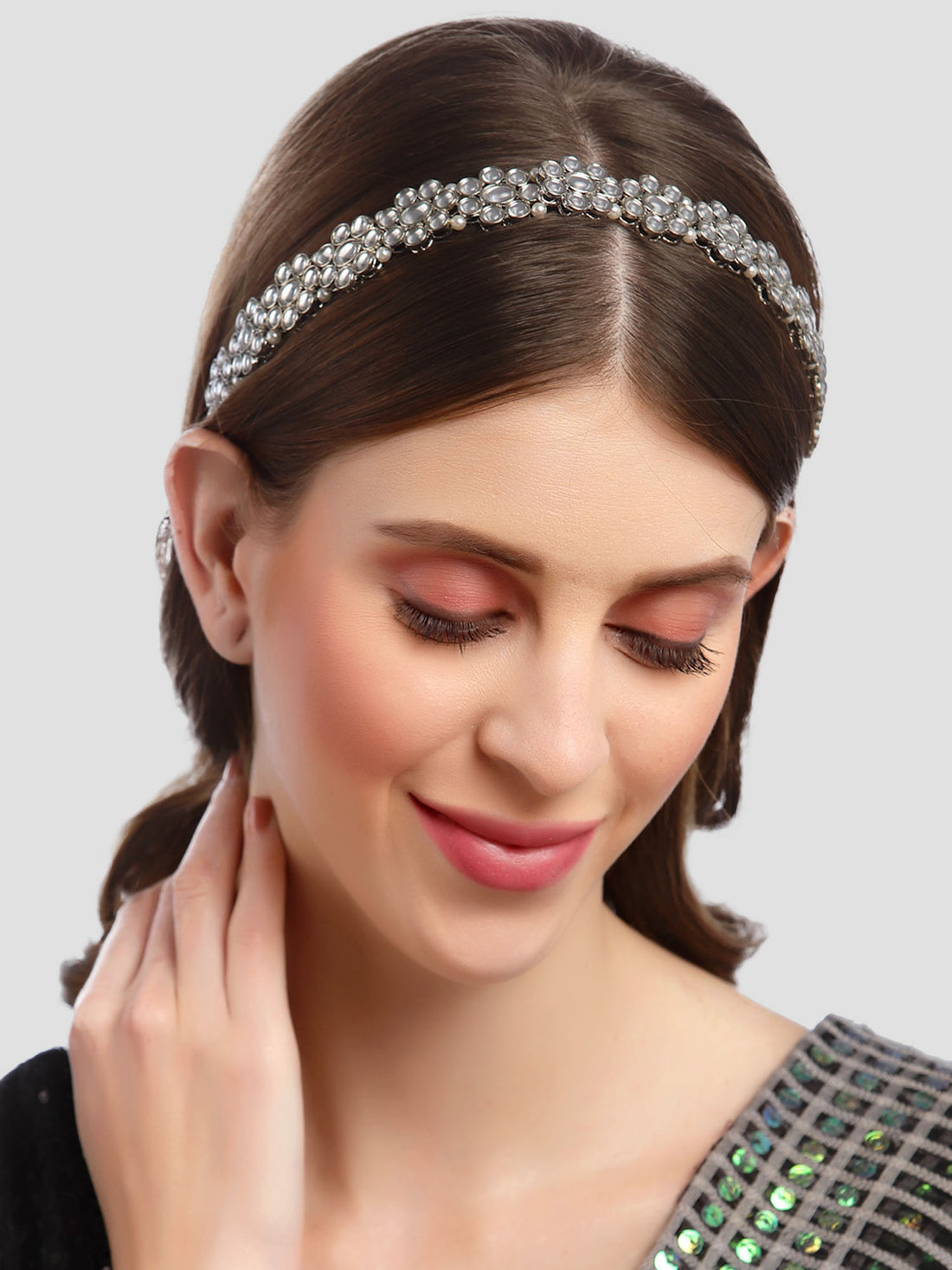 Karatcart Oxidised Silver Kundan Studded Handcrafted Hairband for Women