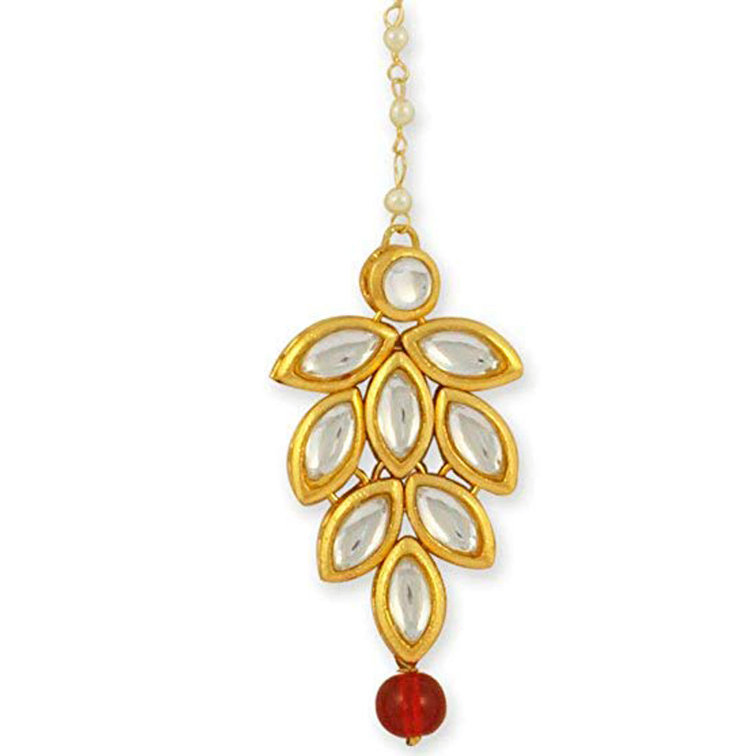 Traditional Gold Plated Red Stones Pearl Beads Kundan Maangtikka For Women