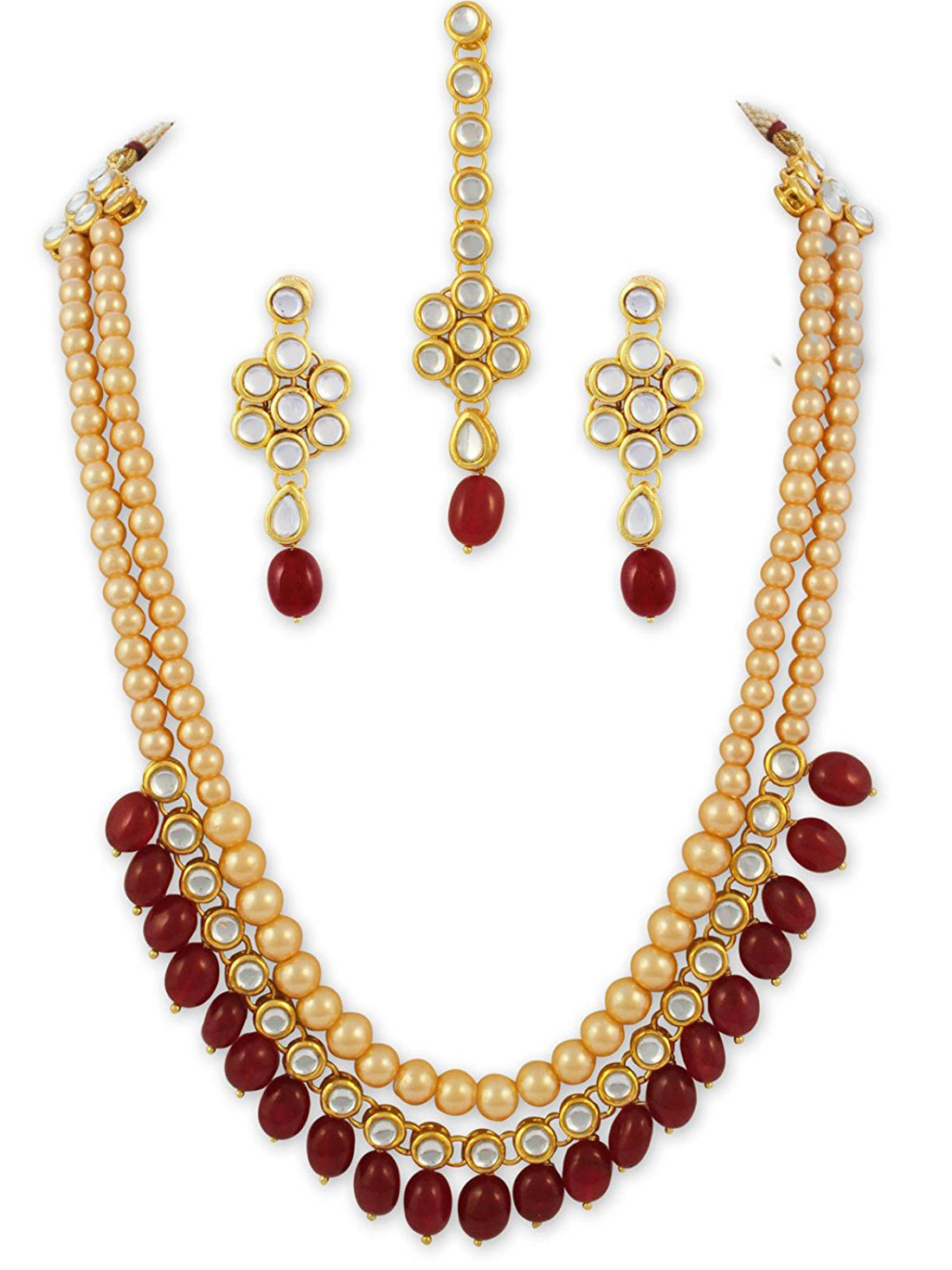 Gold Plated Red Beads Kundan Dangler Earrings with Maangtikka for Women. It's Five Layer Micro...