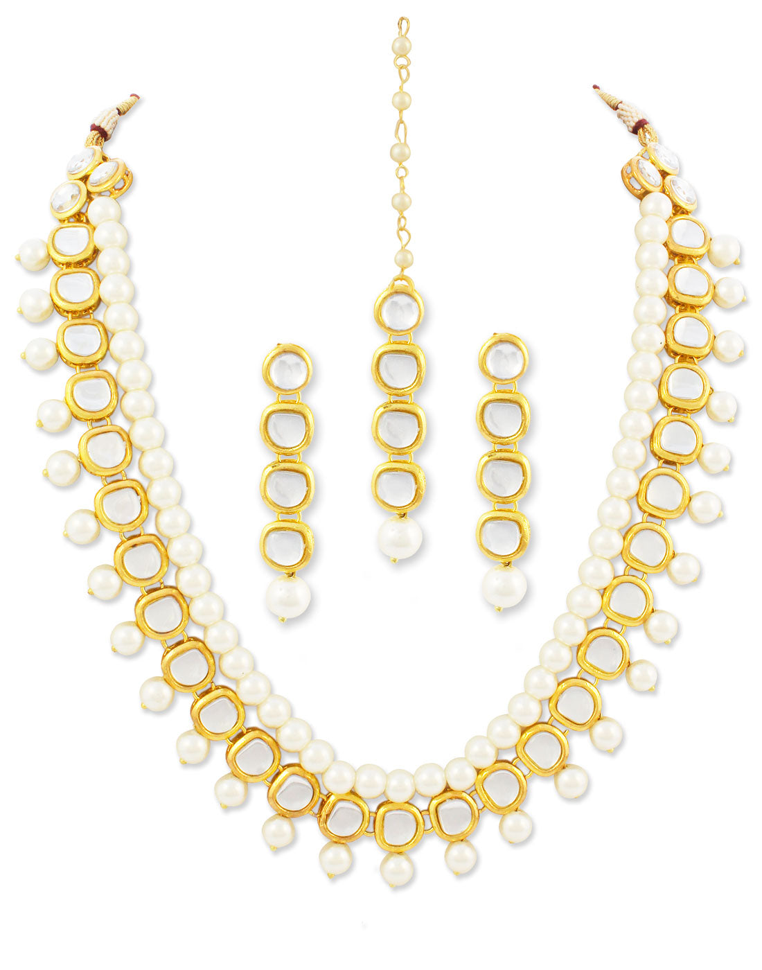 Gold Plated White Beads Kundan Dangler Earrings with Maangtikka for Women. It's Five Layer Micro...