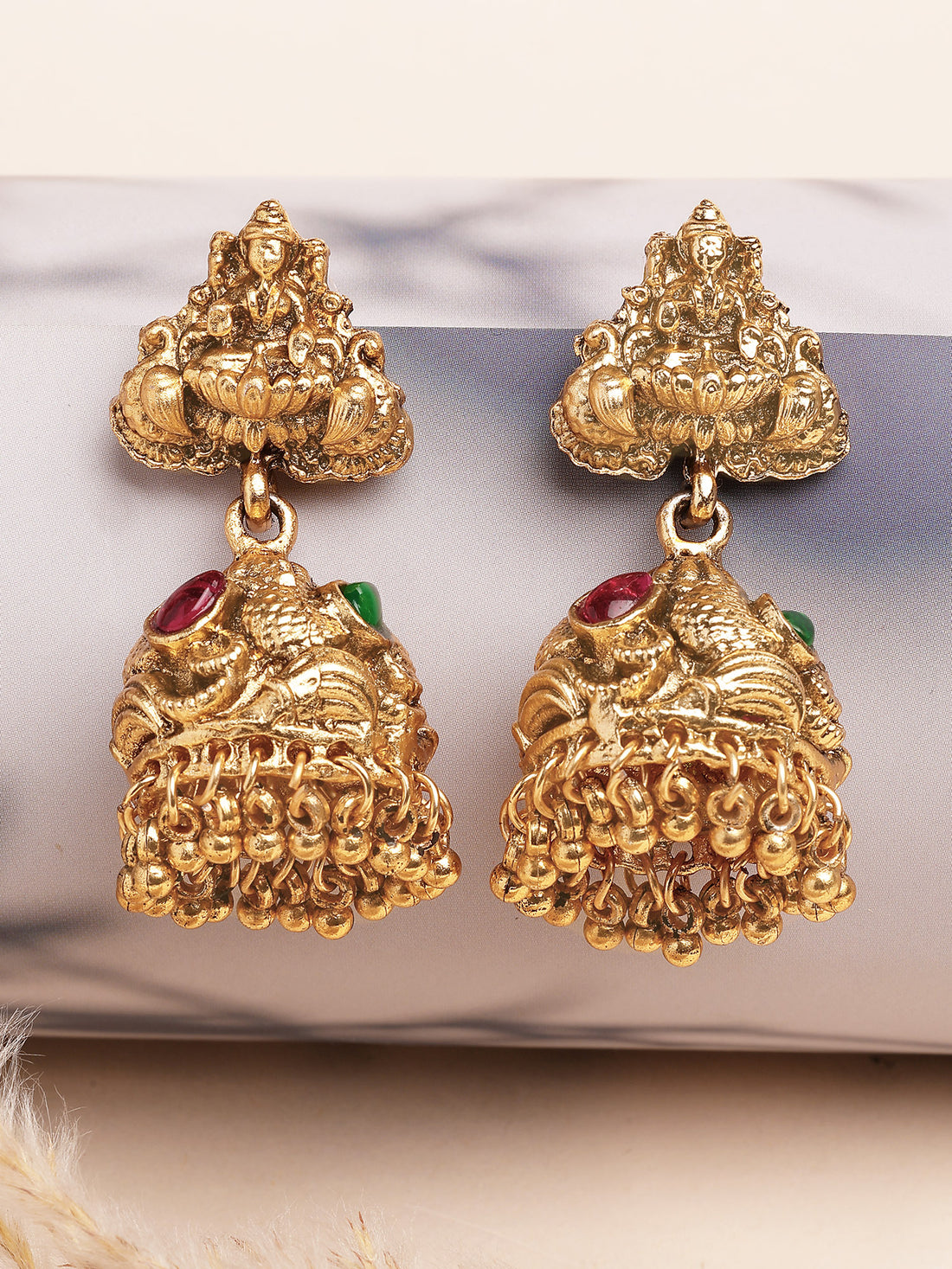Karatcart Elegant Red and Green Stone Gold Plated Laxmi Mata Design Jhumki Earrings for Women
