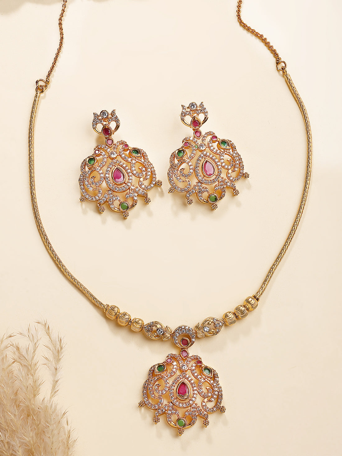 Karatcart Floral Design Gold Plated Red and Green Stone Necklace Set for Women