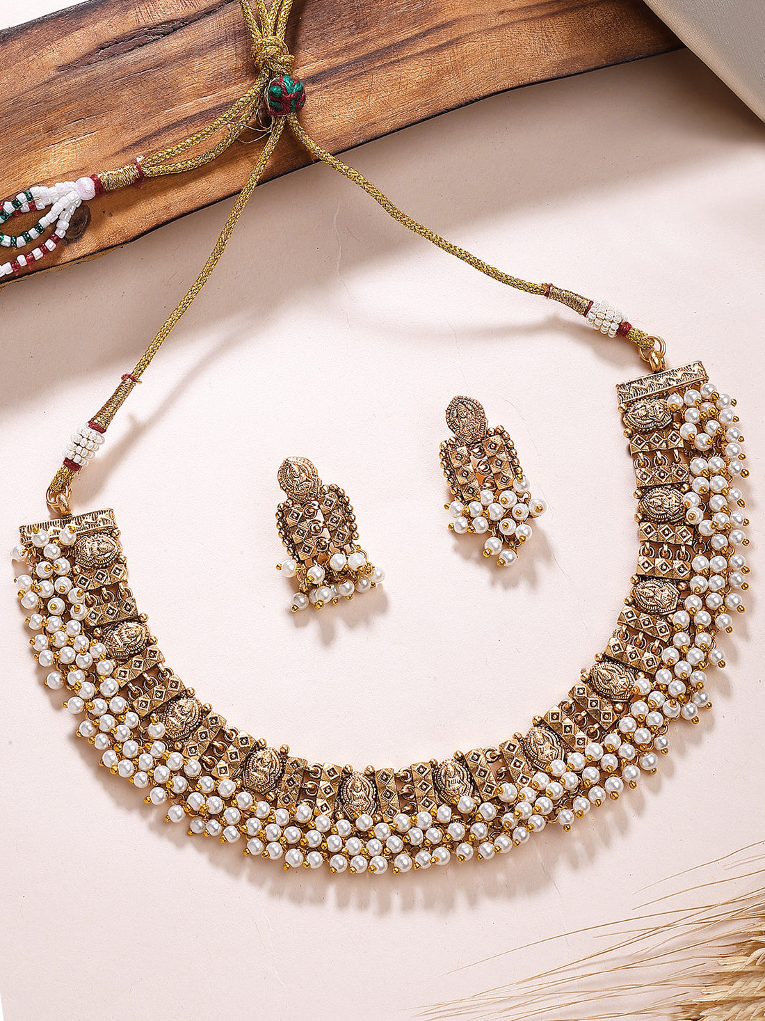 KARATCART Traditional Gold-Plated Laxmi Mata Choker Temple Jewellery Set with Pearl Drops for Women