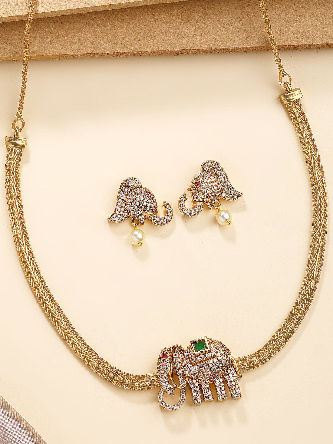 KARATCART Designer Gold-Plated Elephant Motif American Diamond Temple Jewellery Set for Women