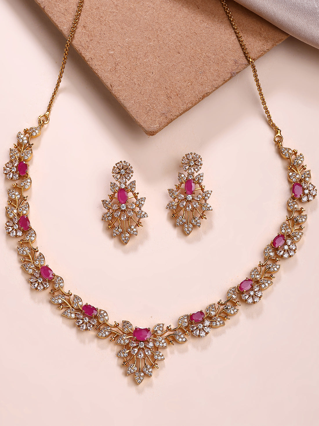 KARATCART Designer Gold-Plated Red American Diamond Floral Jewellery Set for Women