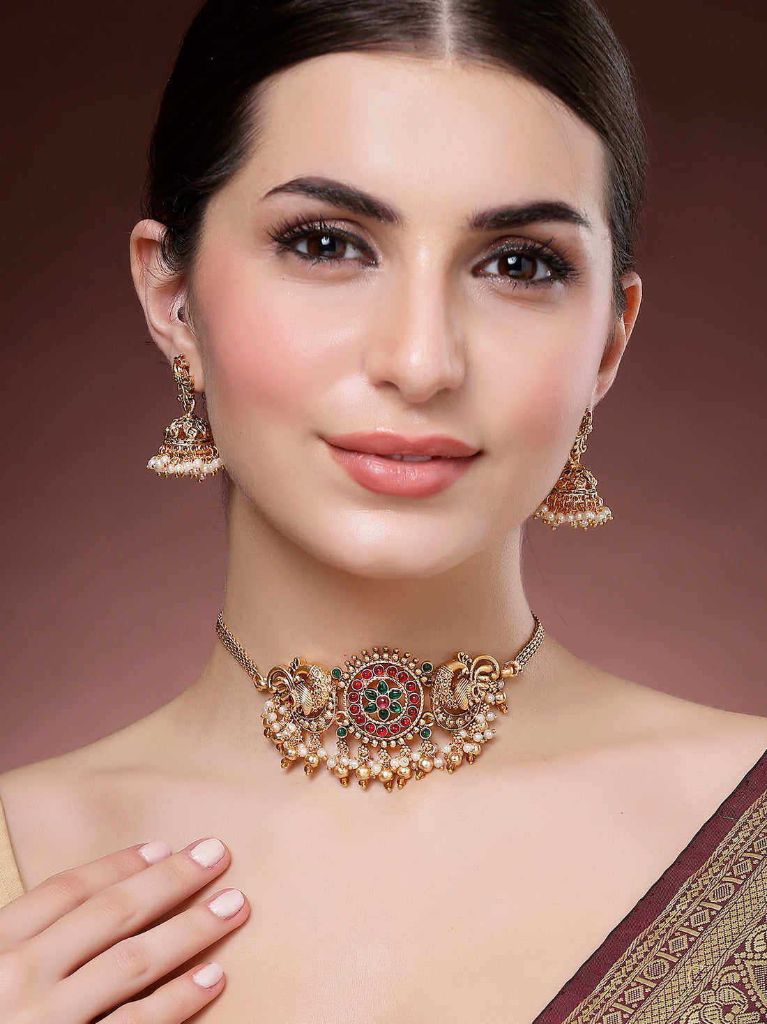 Karatcart Gold Plated Red and Green Floral & Peacock Design Choker Temple Jewellery Set for Women