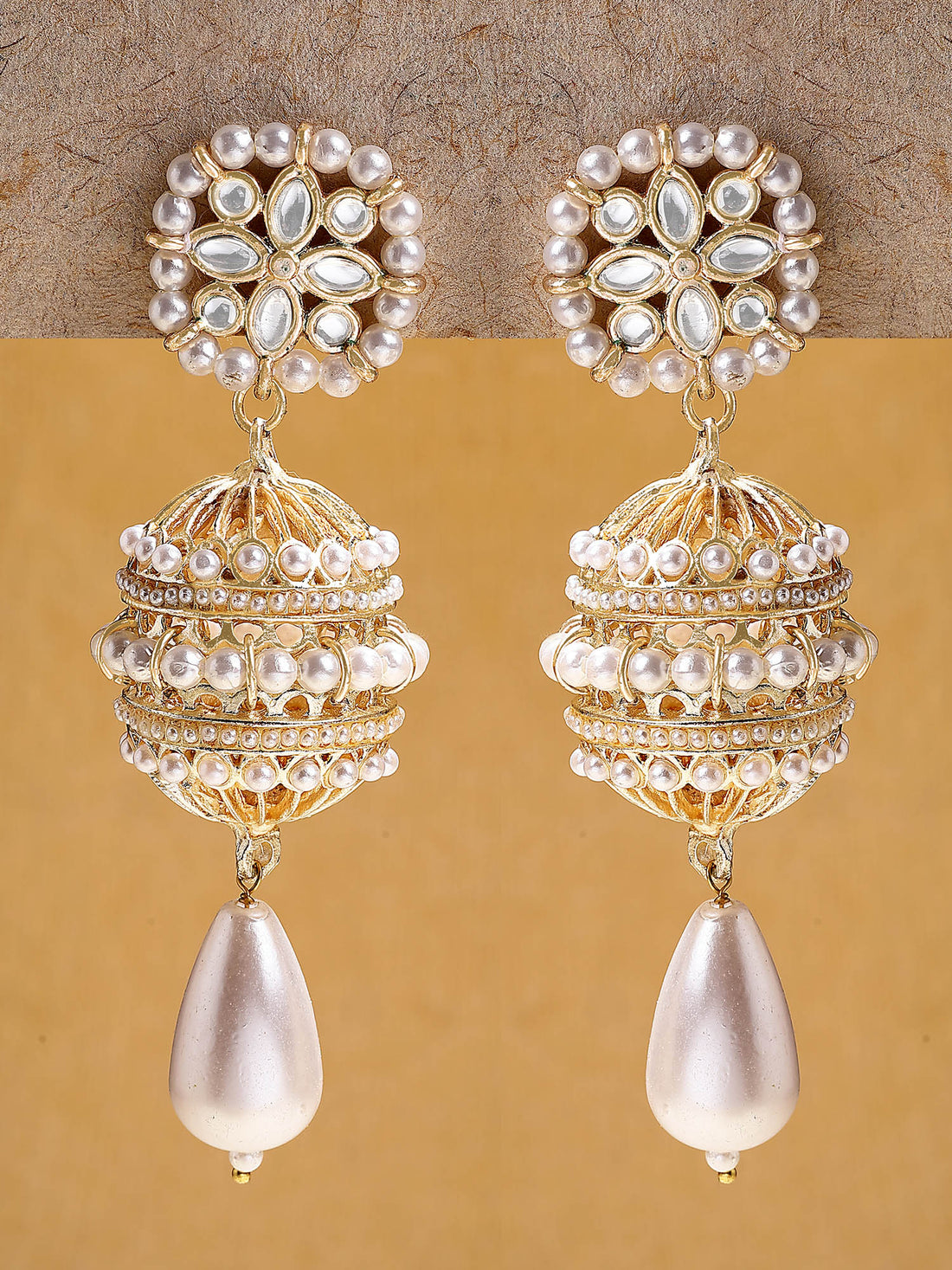 Karatcart Traditional Handcrafted Gold-Plated Teardrop Pearl Dome Kundan Dangler Earrings for Women