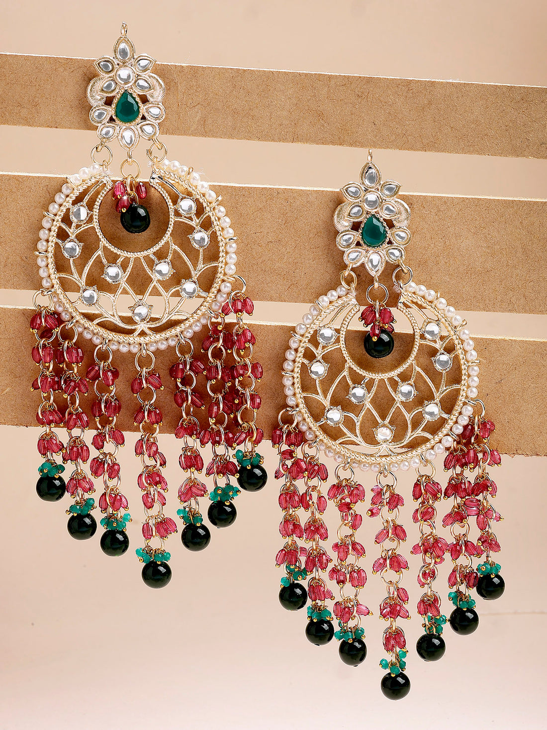 Karatcart Traditional Gold Plated Red Crystal & Green Bead Kundan Chandbali Earrings for Women