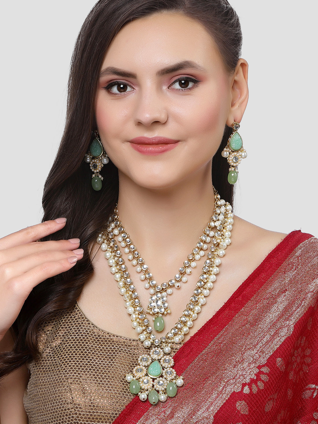 Karatcart Gold Plated Light Green Tumble and Pearl Rani Haar Necklace Set for Women