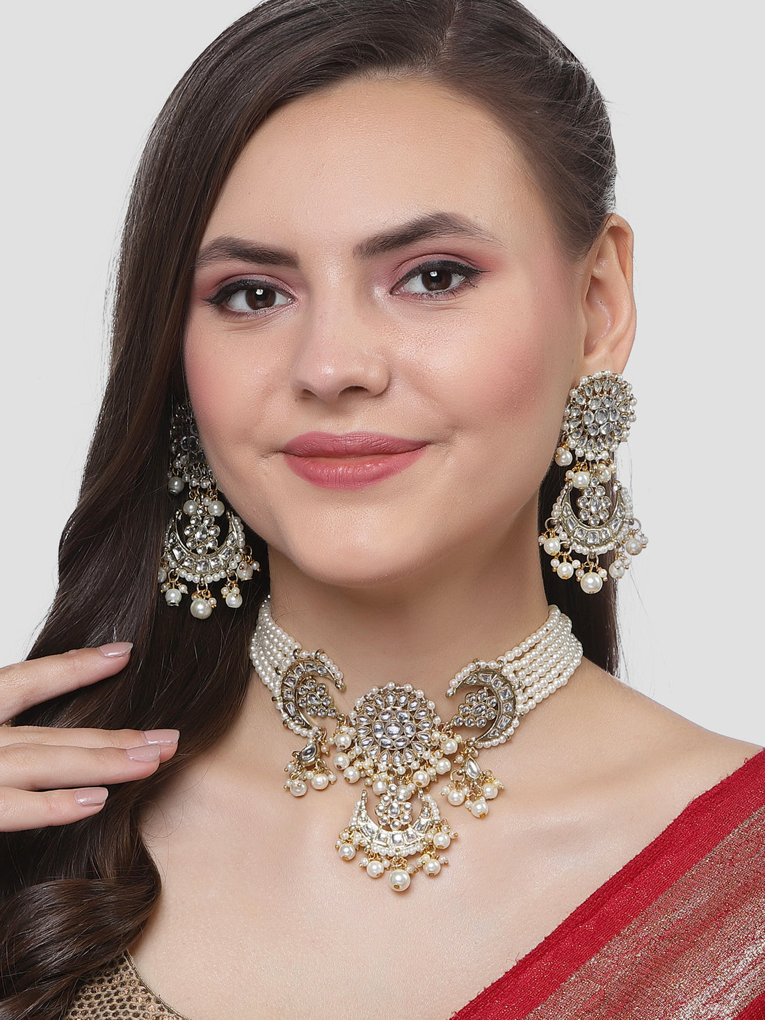 Karatcart Gold Plated Pearl Beaded Kundan Choker Necklace Set for Women