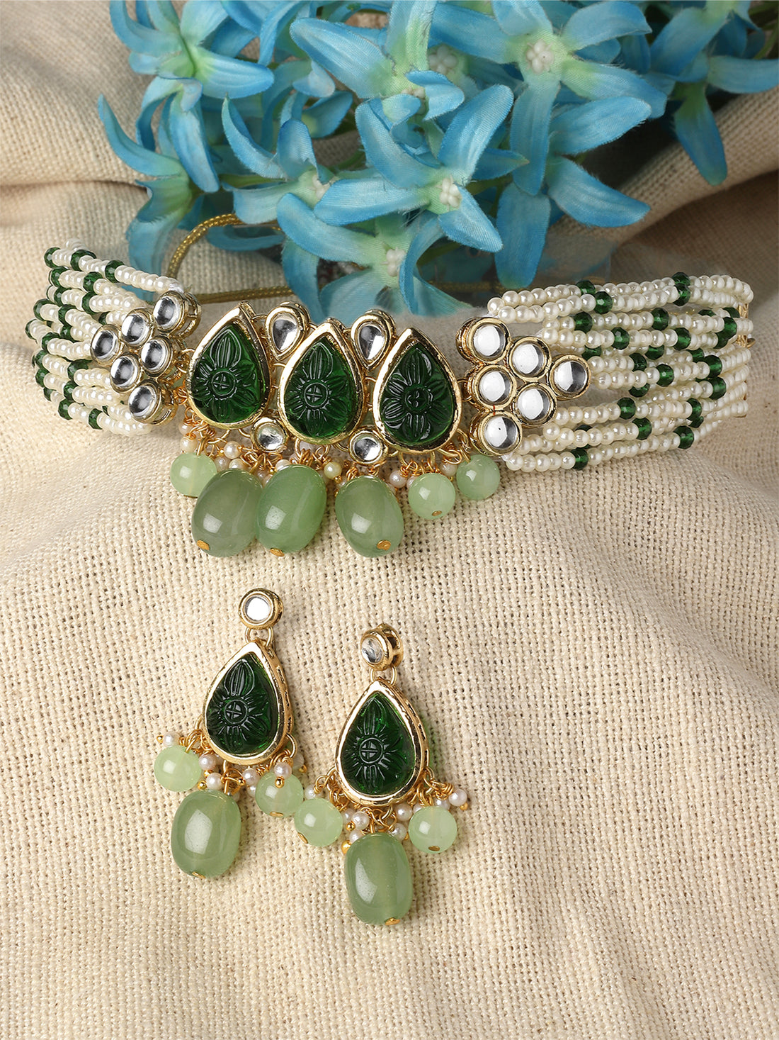 Karatcart Gold Plated Green Beads and Pearl Beaded Kundan Choker Necklace Set for Women