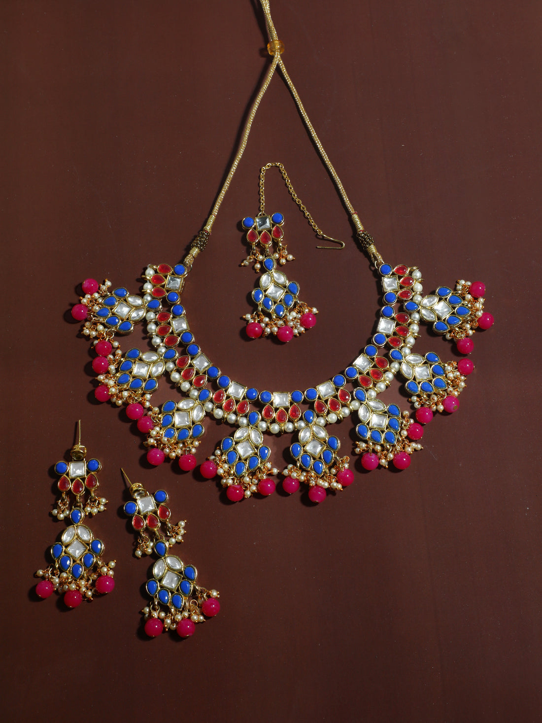 Gold Tone Faux Kundan Blue Jadau Embellished Necklace Set. Pair it with Indian or Indo-Western...