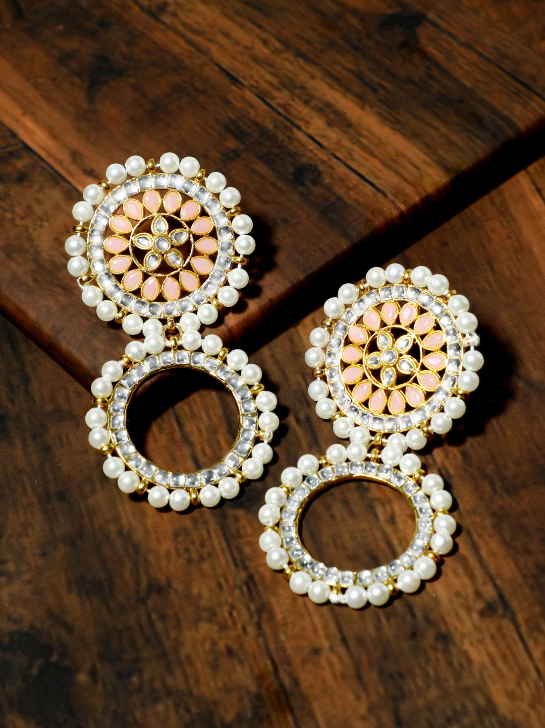 Gold-Tone Peach Stone Studded Kundan Hoop Earring with White Pearls Detailing. This set of earrings can...