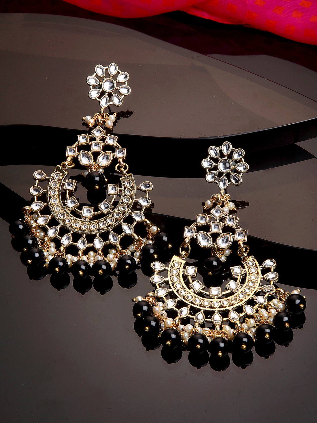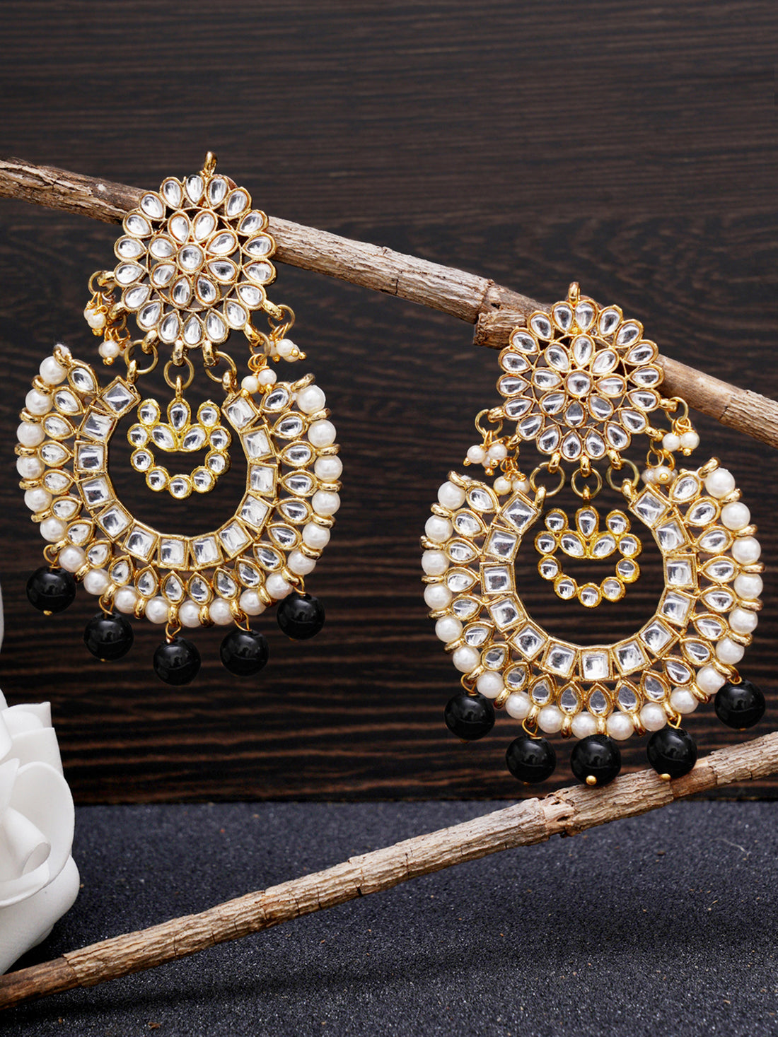 Traditional Gold Plated Black Beads Studded Kundan Chandbali Earrings