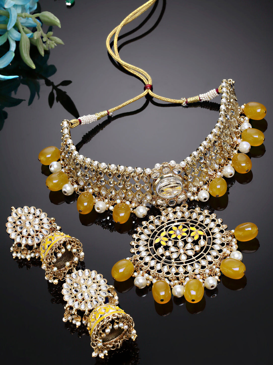 Karatcart Gold Plated Yellow Tumble Studded Kundan Choker Necklace Set for Women