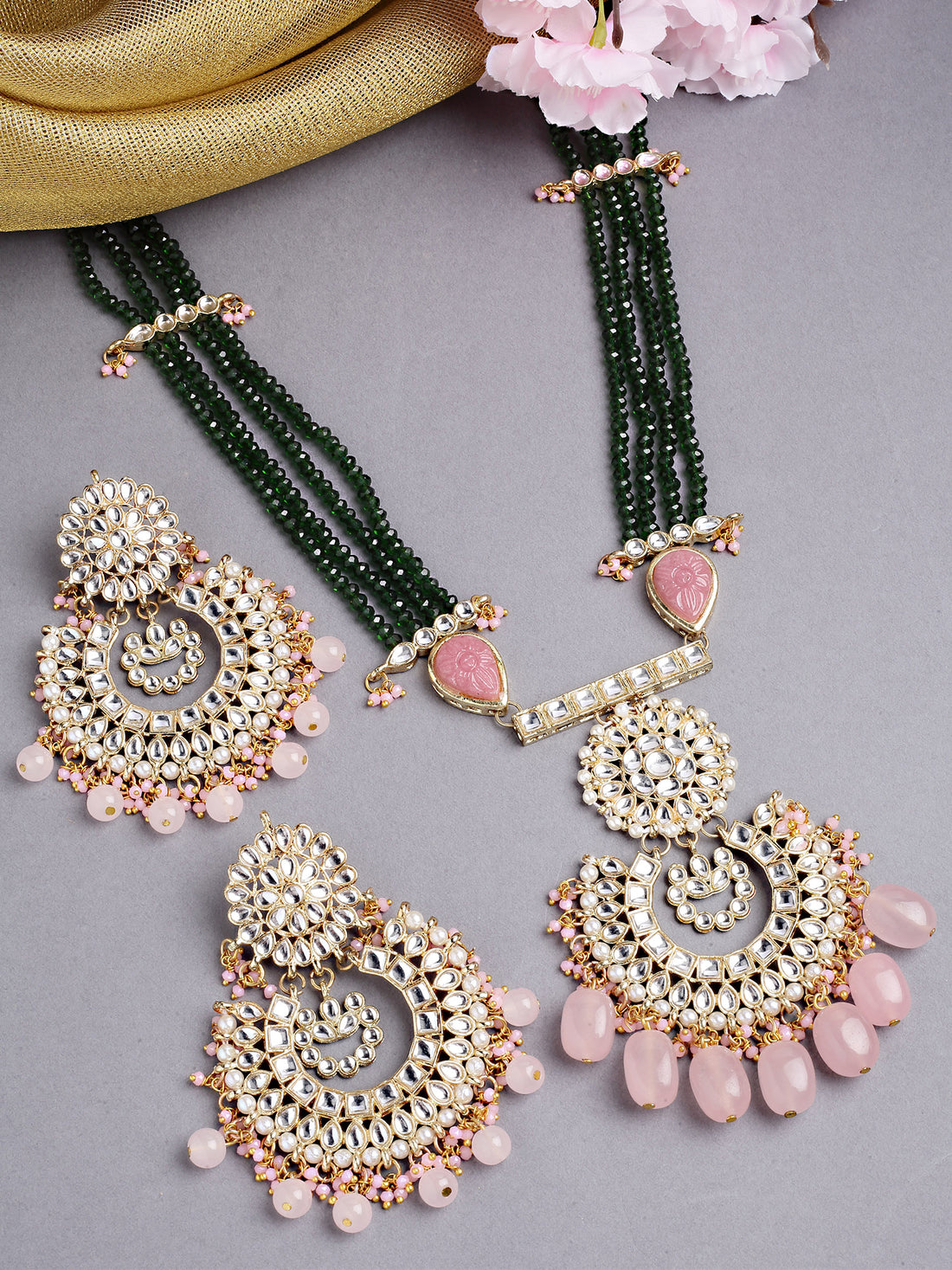 Karatcart Gold Plated Pink Tumble and Green Crystals Studded Kundan Rani-Haar Necklace Set for Women