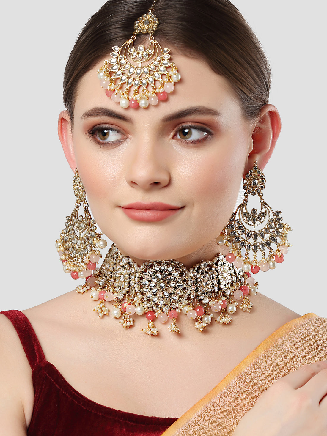 Karatcart Gold Plated Peach and Pink Beads Kundan Choker Necklace Set for Women