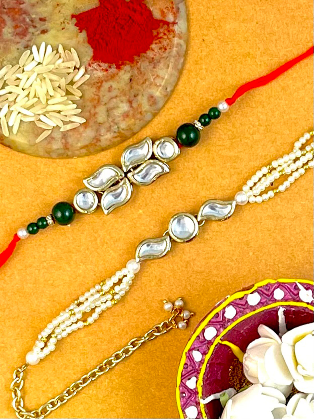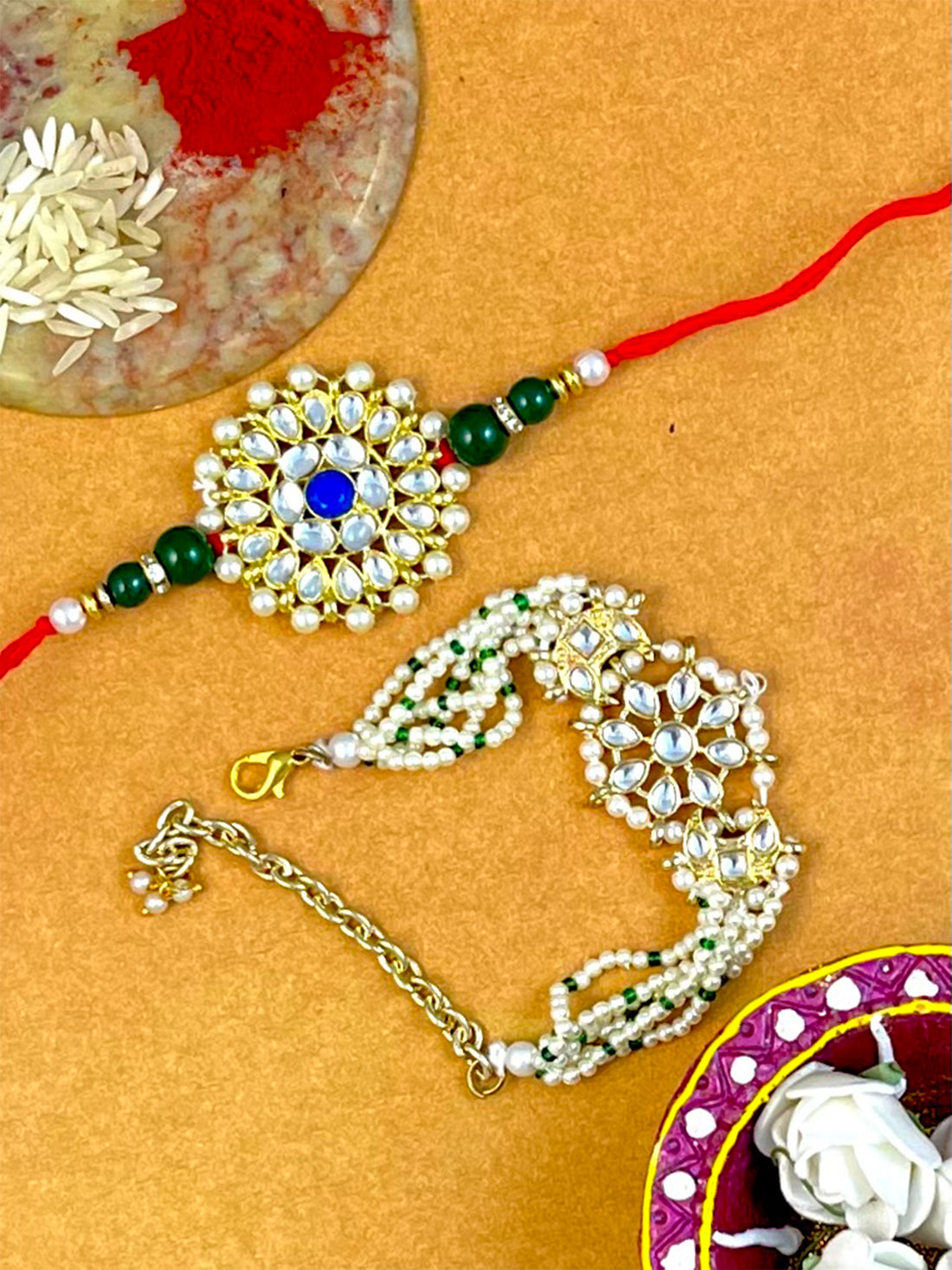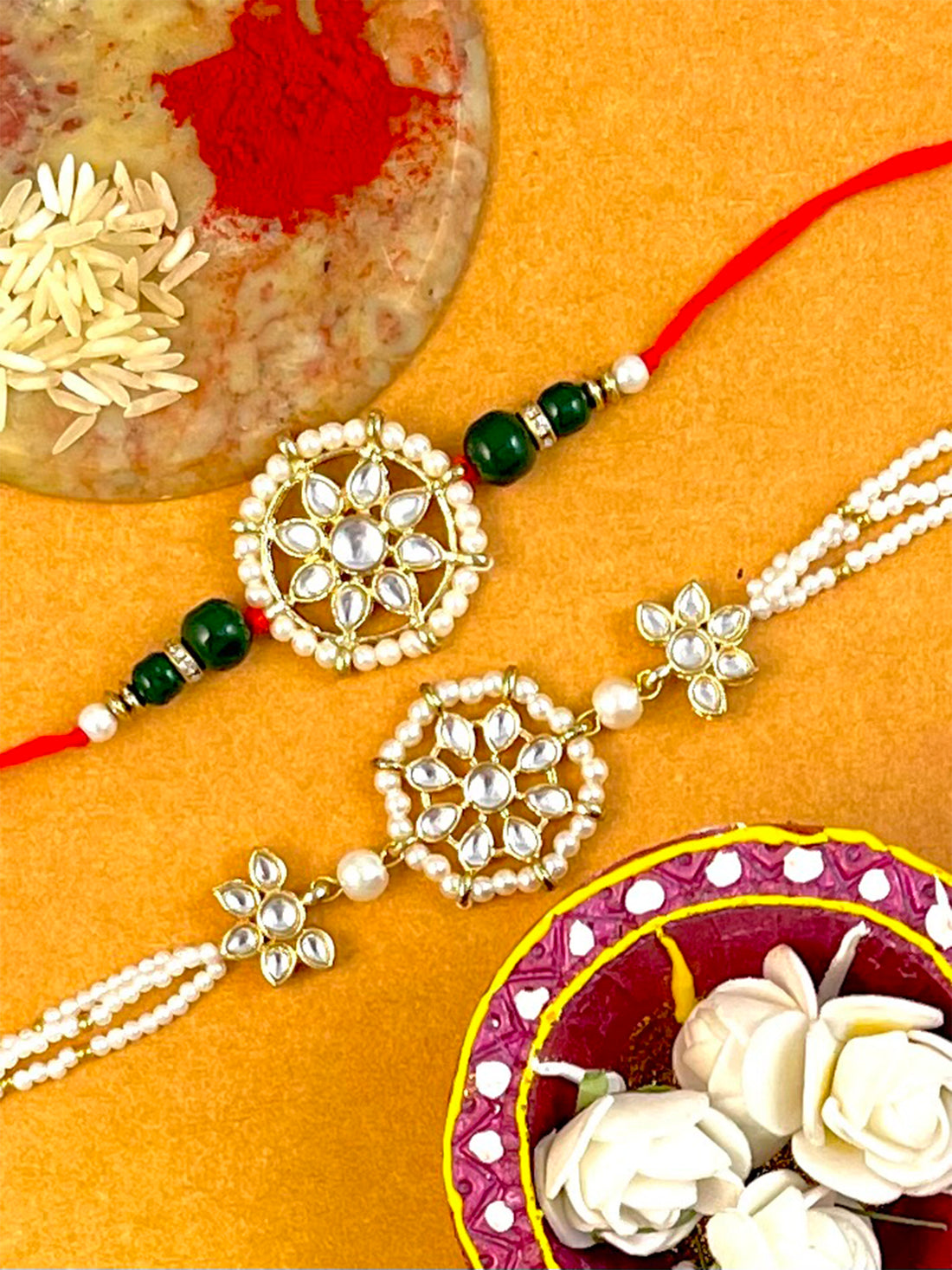 Karatcart Rakhi for Brother and Bhabhi Set of 2 Gold Plated Green Handmade Kundan Bhiya Bhabhi Rakhi Combo with Roli & Chawal