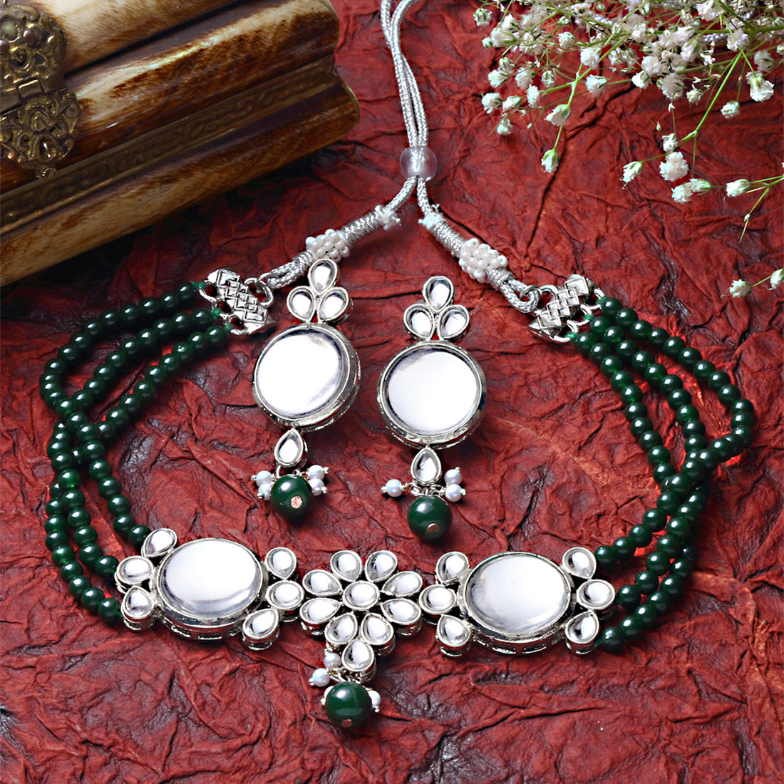 Karatcart Oxidised Silver Green Multistrand Embellished Choker Necklace Setfor Women