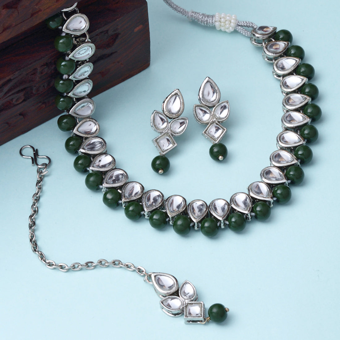Karatcart Oxidised Silver Green Tumble Kundan Choker Necklace Setfor Women