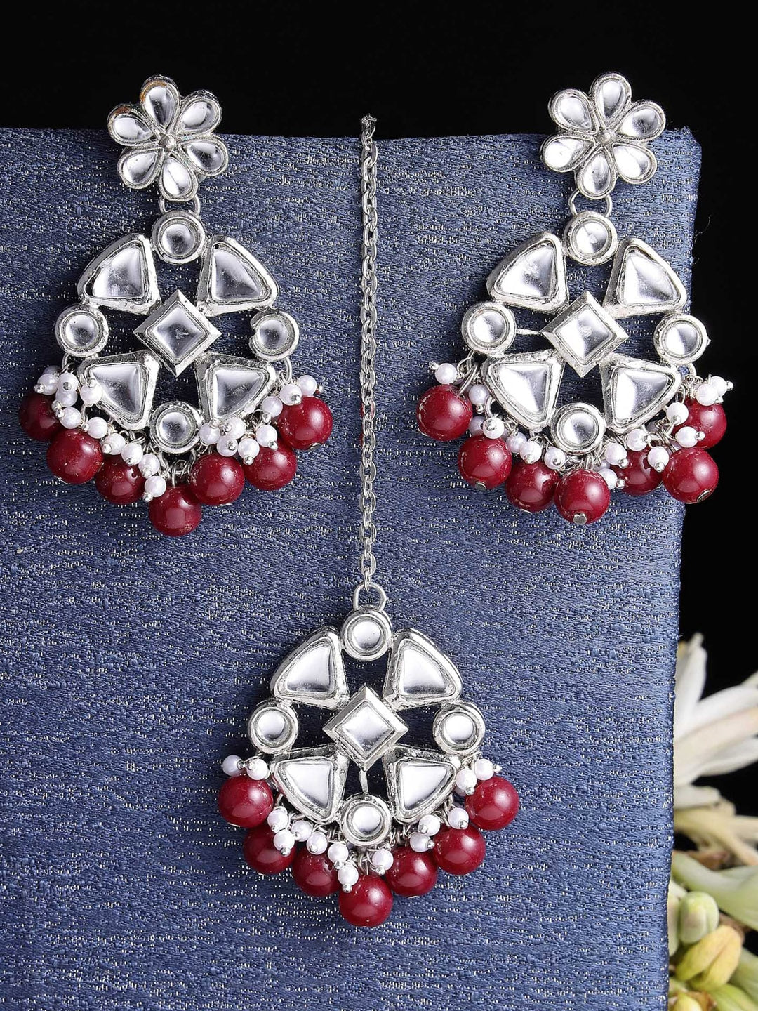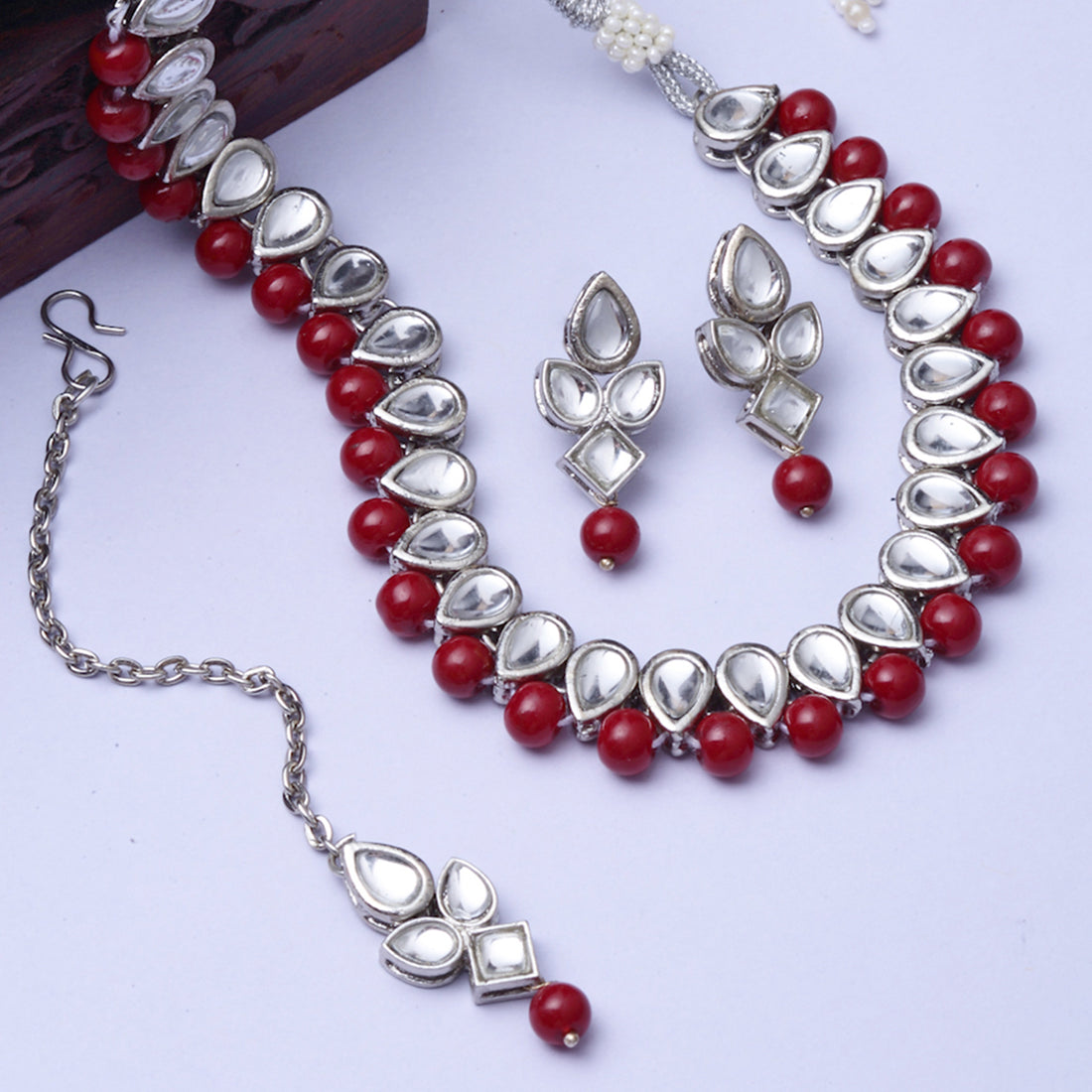 Silver-Plated & Red Beads Kundan Studded Jewellery Set