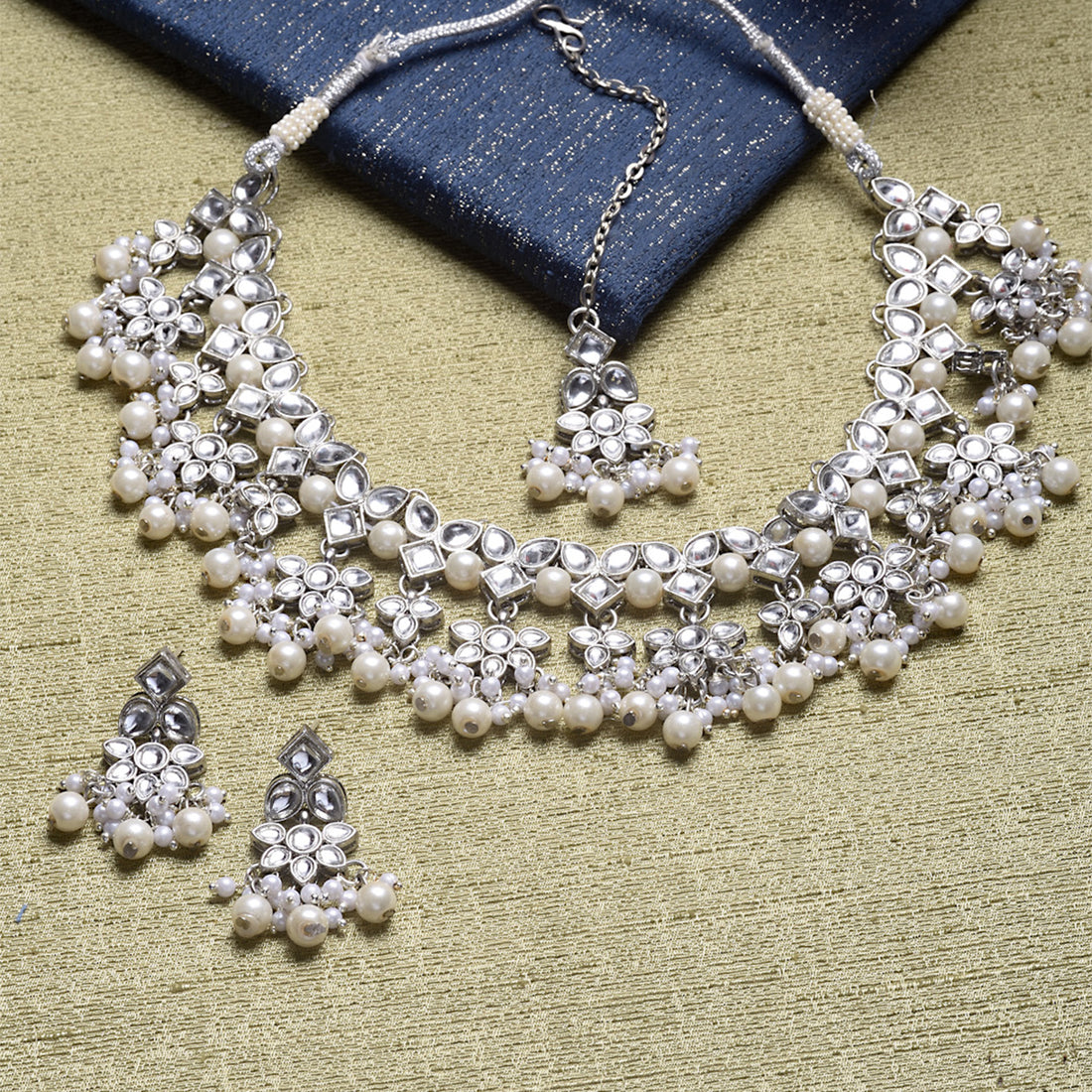 Oxidised Silver-Plated White Kundan-Studded Beaded Jewellery Set
