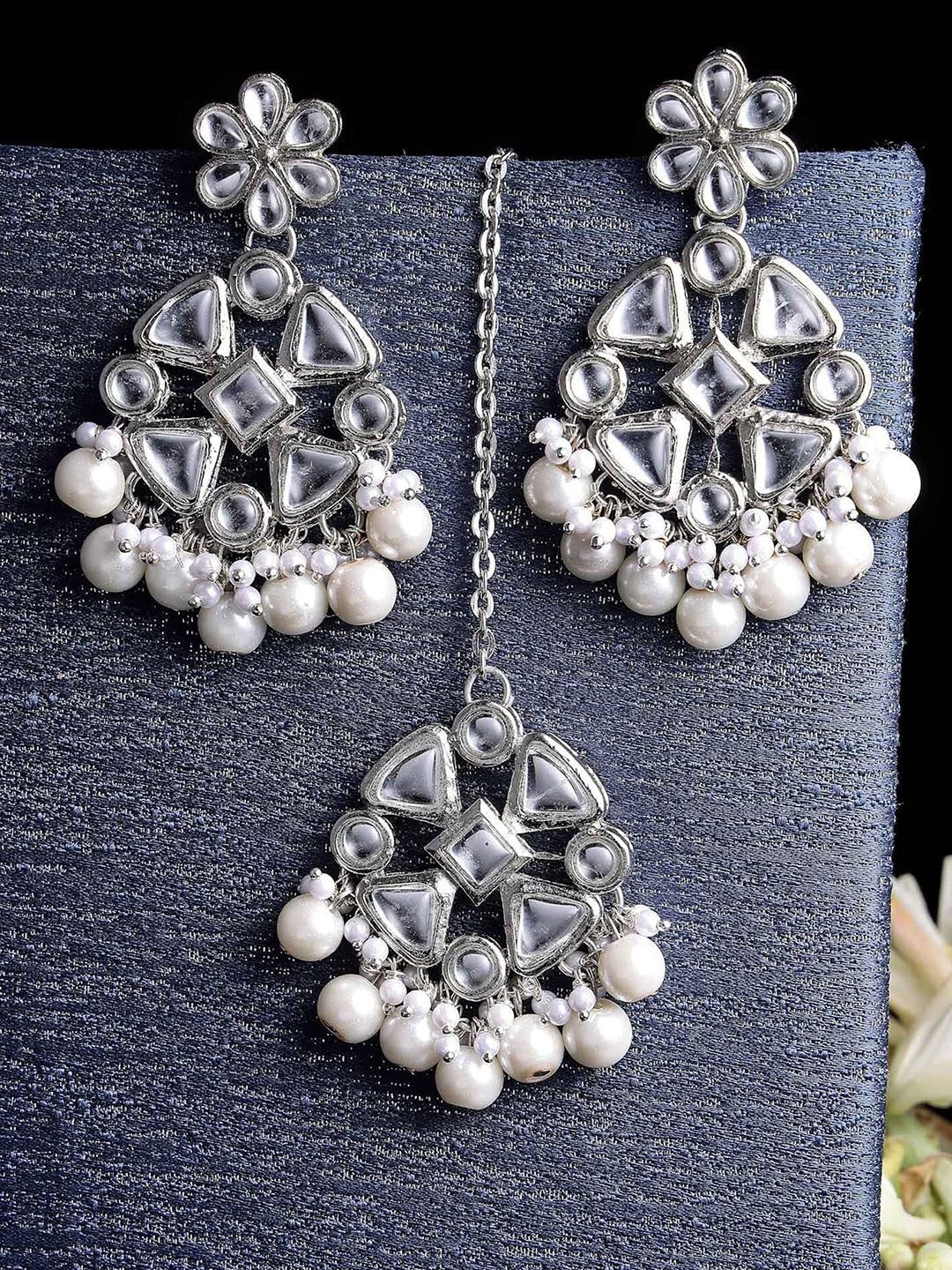 Oxidised Silver-Plated White Kundan-Studded & Pearl Beaded Earring with Maangteeka