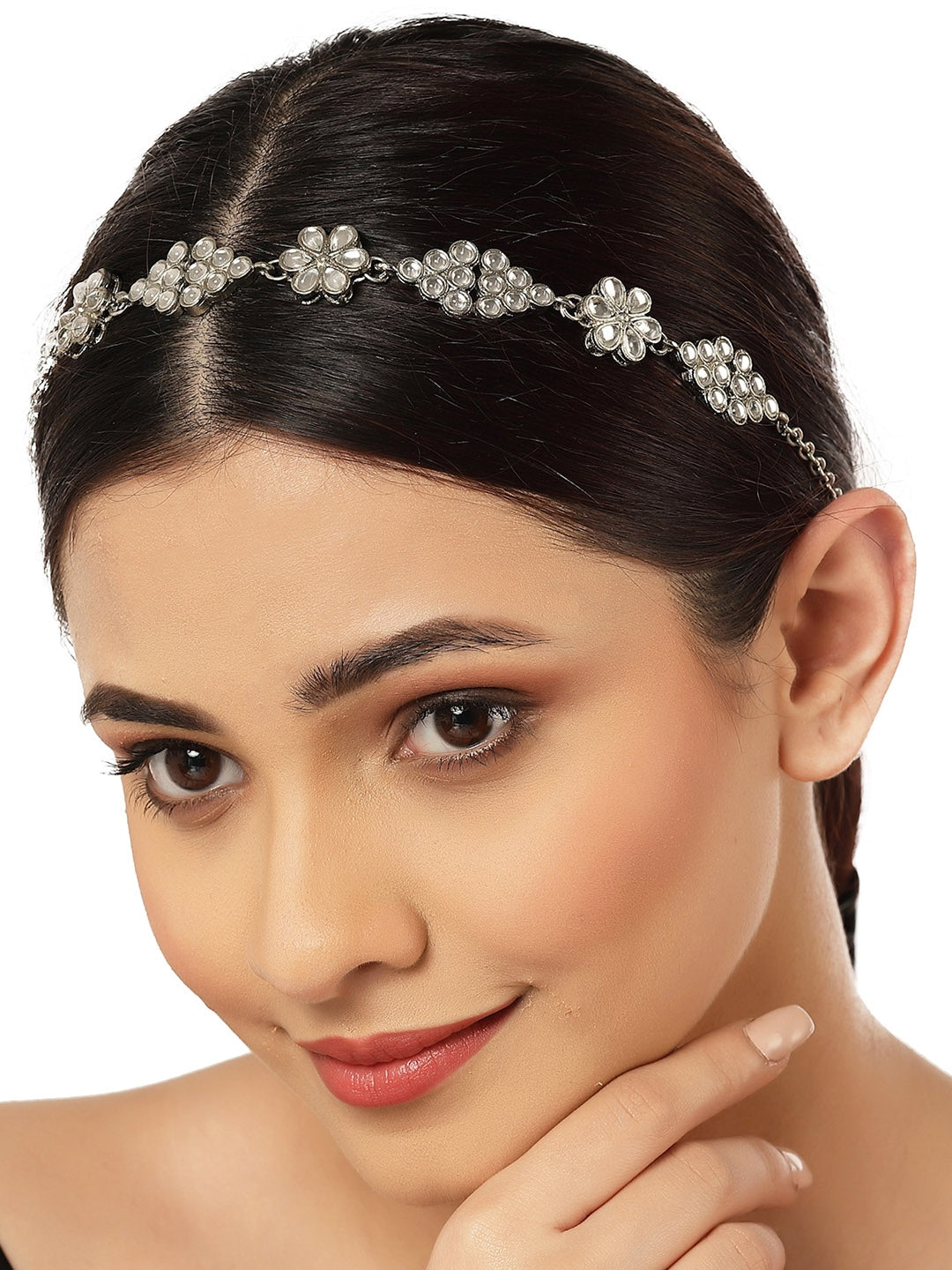 Women Silver-Toned & White Embellished Oxidised Silver White Kundan Hairband