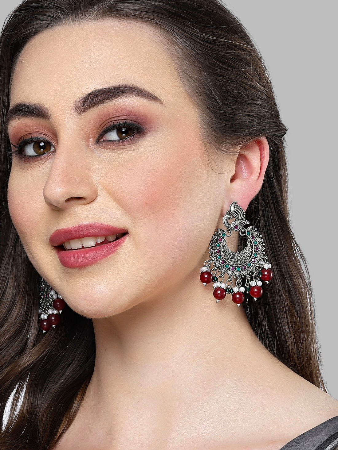 Karatcart Oxidised Silver Peacock Red Stone Studded Dangler Jhumki Earrings for Women