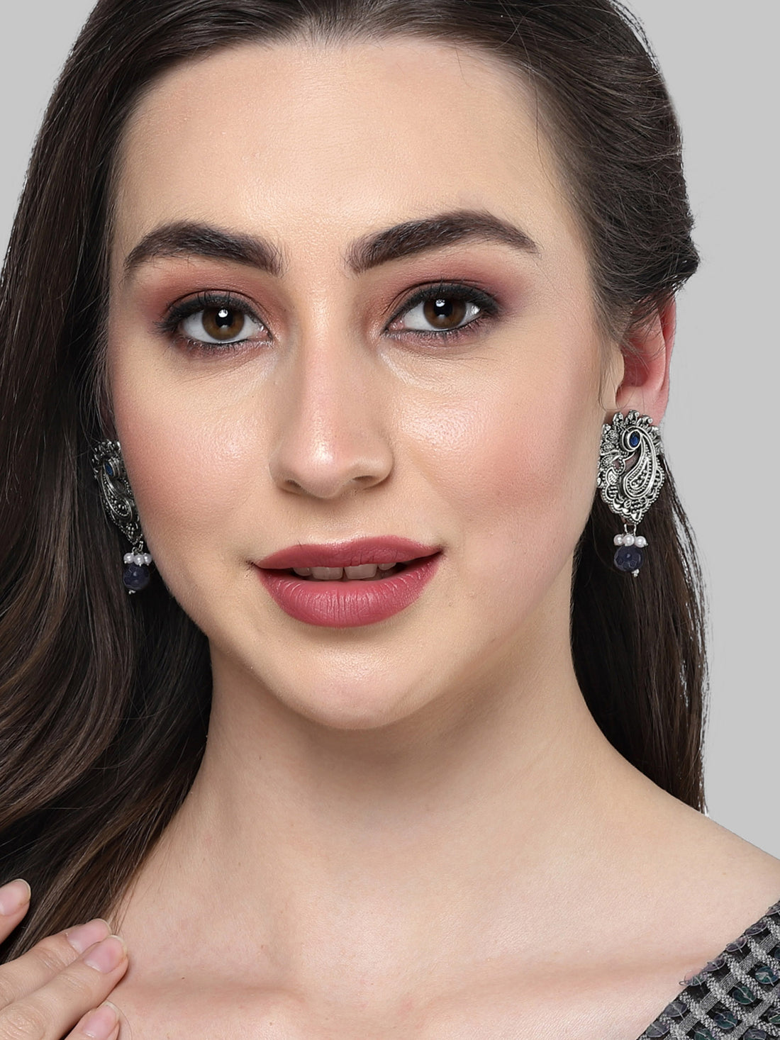 Karatcart Oxidised Silver Peacock Design Black Stone Drop Earring for Women