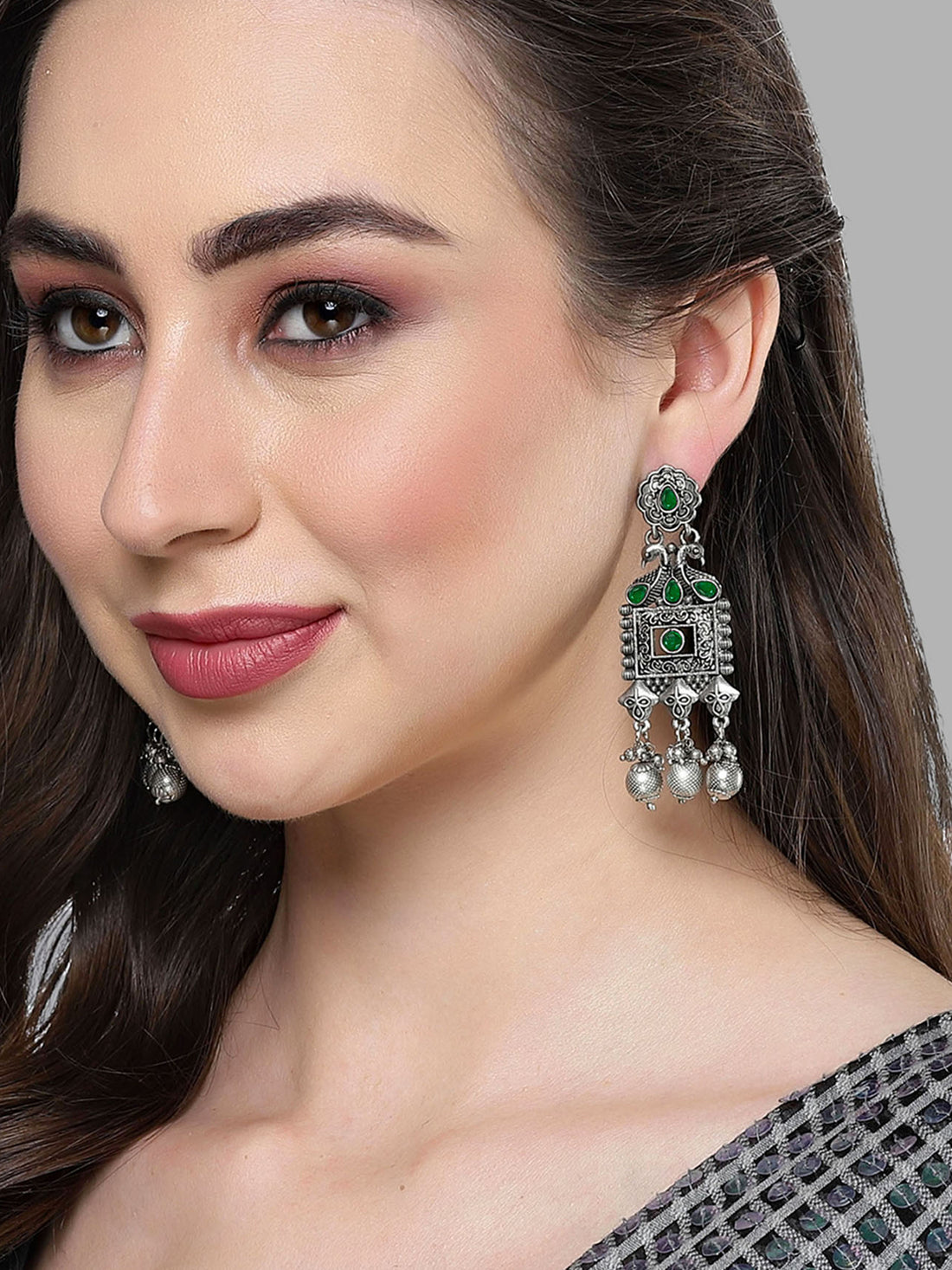 Karatcart Oxidised Silver Peacock Design Green Stone Drop Earring for Women