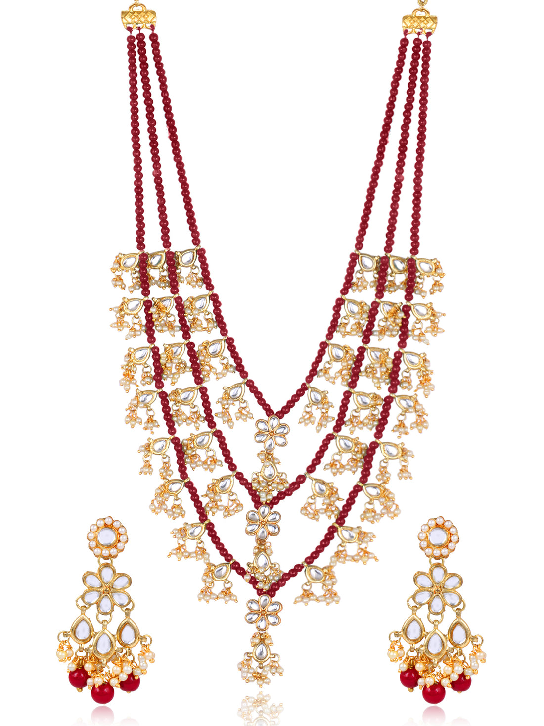 Karatcart Red Gold-Plated Handcrafted Kundan Stone-Studded Multistrand Jewellery Set Material: Kundan. Colour: Red. Necklace length:-...