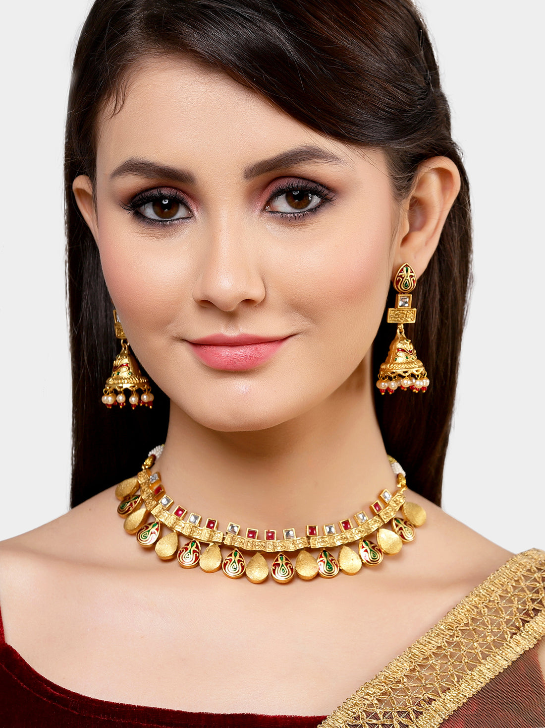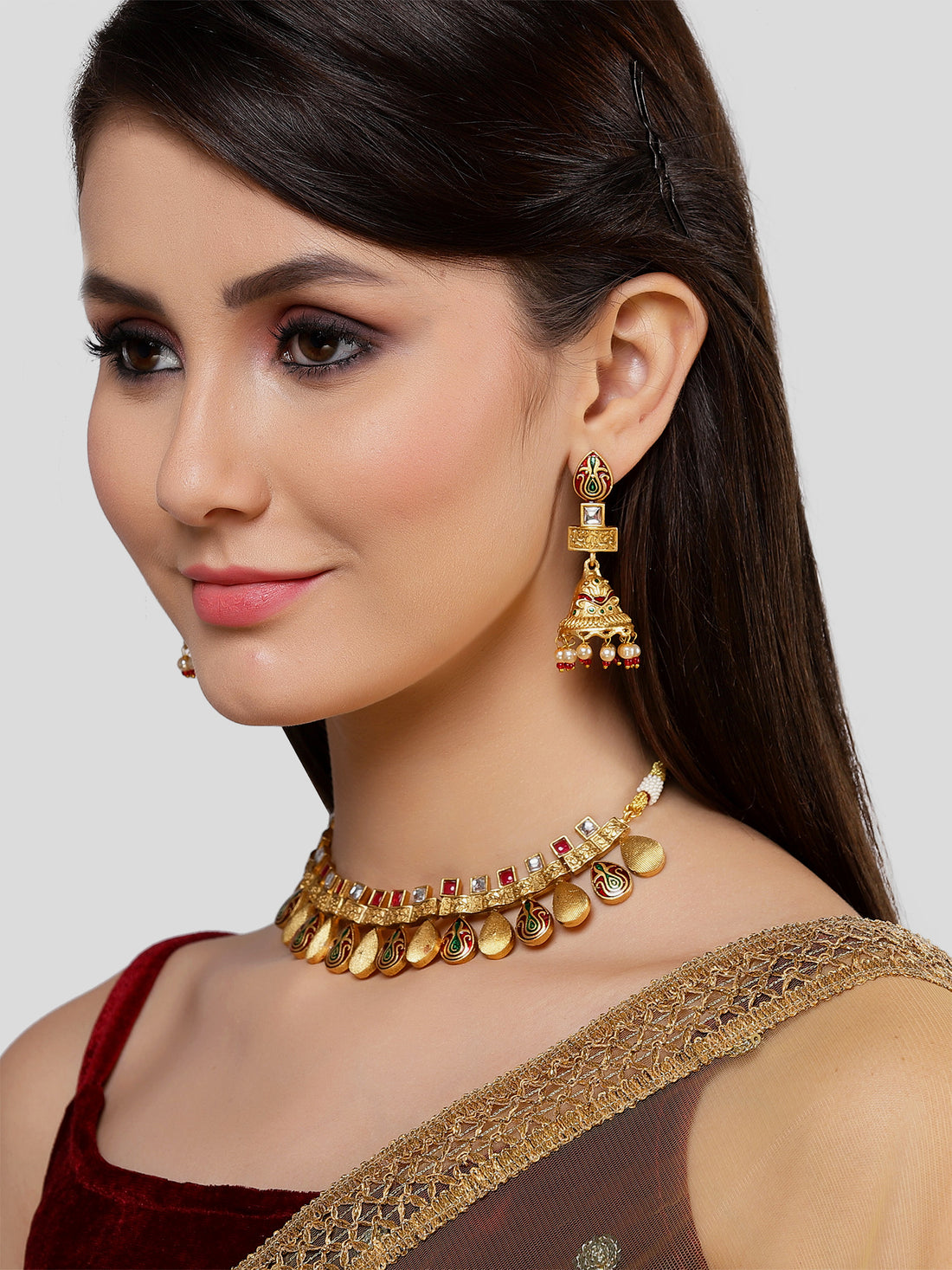 Karatcart Antique Gold Plated Red Meena Necklace with Jhumki Earrings for Women